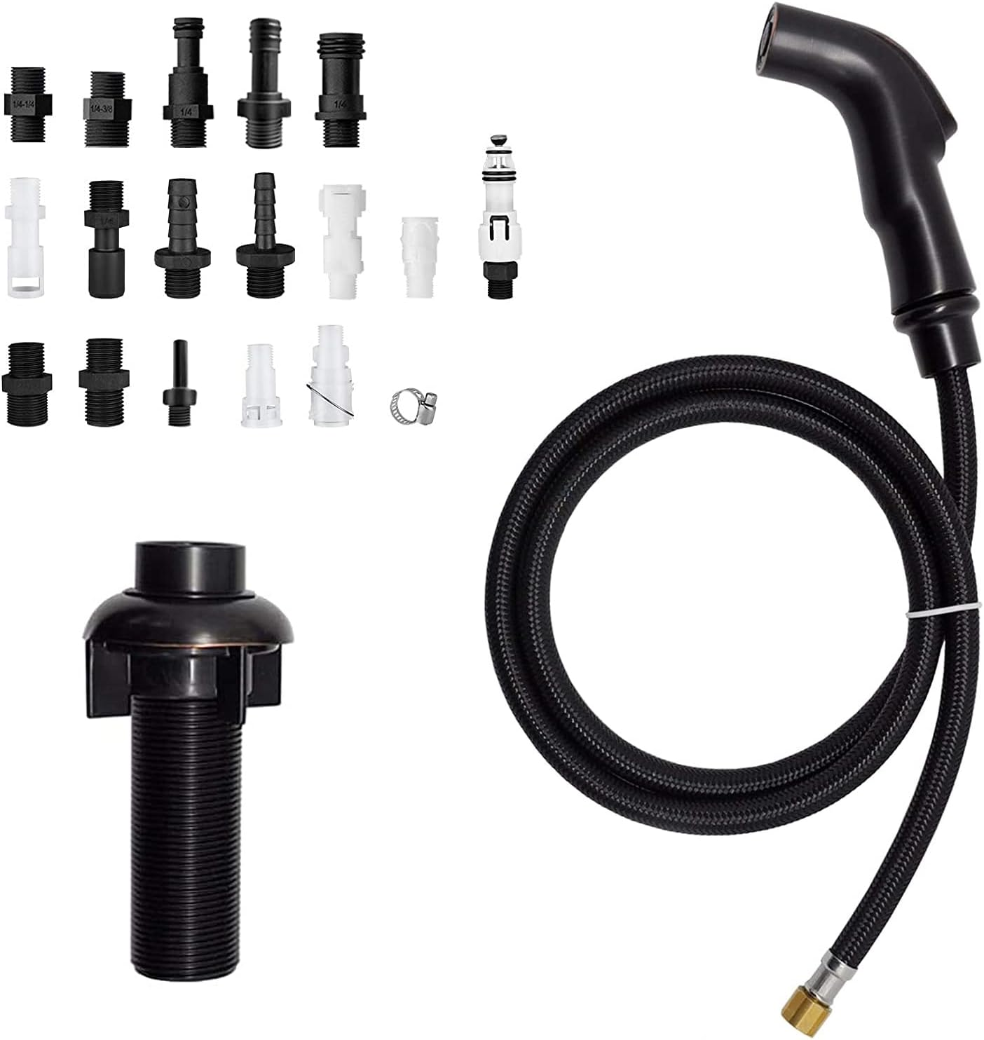 ✅DURABLE QUALITY OF KITCHEN SPRAYER - Durable ABS plastic construction with scratch and stain resistant protection for kitchen sprayer heads and holders, passed the salt spray test. ✅EASY TO USE - Thumb applied trigger action is easy to wash greasy dishes and provides high pressure directional power spraying. Easy-to-clean spray head that prevents mineral buildup. ✅SURFACE FINISH - Engineering grade plastic(ABS) constructed, ensuring quality and longevity. Smoothfinishes resist scratches, corrosion and tarnish. ✅Great Customer Service- We will reply within 8 hours after receiving your email and offer free 30 days returns and 1 years free maintenance. Product Description 1 SINK SPRAYER WITH HOSE 2 EASY TO USE Kitchen Sprayer Head without Hose/Holder Color Brushed Nickel Color Chrome Color Brushed Nickel High Pressure Sprayer Head The high-pressure sprayer head is easy to clean hard-to-reach spots and smudges. High Pressure Sprayer Head The high-pressure sprayer head is easy to clean hard-to-reach spots and smudges. High Pressure Sprayer Head The high-pressure sprayer head is easy to clean hard-to-reach spots and smudges.