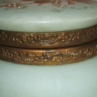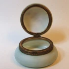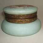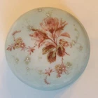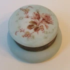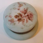 One apx 4 1/2" diameter x 2 1/2" tall decorated opalware hinged Wave Crest round art glass vanity / dresser / puff box. Unmarked, but produced by the C. F. Monroe Company of Meriden, Connecticut circa 1910. White enameled hand painted flower centers over a floral transfer on the lid. No chips or cracks. The metal closure tab on the center of metal lid ring is missing, but the weight of the lid keeps the box closed. Terms & conditions: Buyer pays shipping. Items shipped to address provided by ebay, no exceptions. Email questions before bidding/buying. US sales only. Payment due within 2 days of end of auction/purchase. I ship 3 times a week. I will not delay shipping at request of buyer. Read item description; items sold as is. I have a limited return policy. If you have an issue contact me.