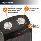 ✅【3 QUIET SETTINGS】Including high heat, low heat, and fan only make this electric space heater ideal for warming up an area in your home or home office. Combined with an adjustable thermostat This personal space heater is great for small areas. ✅【ADJUSTABLE THERMOSTAT】Allows you to adjust the heater's 1500 watt ceramic heating element. With 11 different temperature settings you're sure to find a comfortable setting. Simply turn the dial to the heat setting you desire and enjoy comforting heat. ✅【CONVENIENT CARRY HANDLE】The built-in handle makes it easy to move the space heater. Thanks to the heater's compact Size and convenient carry handle you can easily move the heater from the kitchen, to the bedroom, or under the desk. ✅【BUILT-IN SAFETY FEATURES】Overheat protection ensures the space heater does not overheat even if left on for an extended amount of time. The space heater also features a cool-touch exterior. This allows the space heater's body to stay cool even when it's on high. For added safety, this portable space heater is ETL Listed. ✅【FULLY ASSEMBLED】Allows you to take the heater out of the box and have it working it minutes. Simply plug the heater into a wall outlet, select your desired heat and thermostat settings, and enjoy the warmth from your new Lasko space heater. This compact space heater from Lasko brings 1500 watts of comforting warmth to your room. A classic design in black with easy to use manual controls and built-in safety features, plus adjustable thermostat for personalized comfort. Two convenient knobs located on the top of the heater allow you to set the adjustable thermostat to your desired temperature and select from 3 quiet settings; high heat, low heat, or fan only.