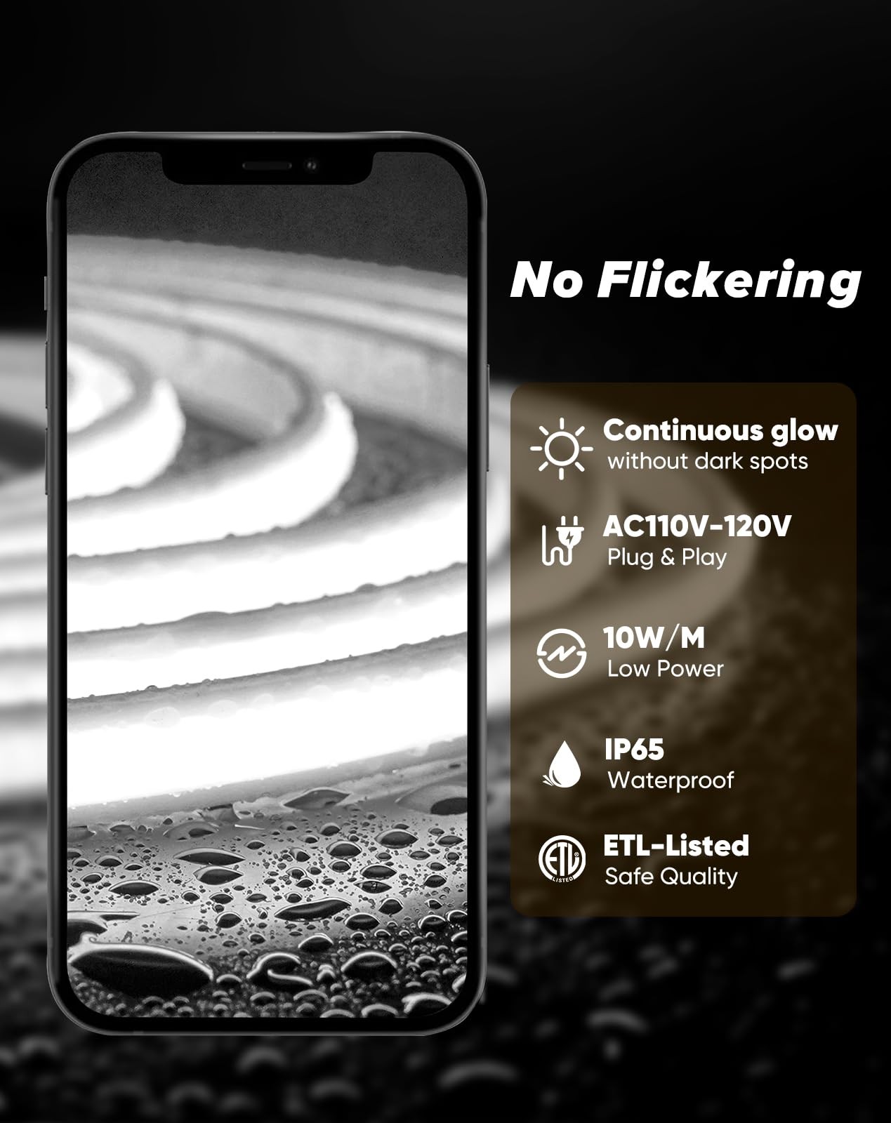 For Home,Commercial Lighting Unparalleled Brightness: Illuminate your space with 2800K warm white or 6000K cool white COB led neon rope light(10 mm W*4.5 mm H). High-density design, one led bead has 2 led chips which has a total 2*286 LEDs/M and a remarkable 800 LM/M ultra-bright output. Flicker-free for naked eye and video shooting 1 meter away. No voltage drop, enjoy consistent and radiant light. Unroll the light roll fully before lighting up to avoid overheating Continuous Illumination: Covered by food-grade real silicone, cob rope light shine continuous glow that eliminates dark spots, creating a stunning vivid ambiance with CRI 80+. Perfect for enhancing the ambiance of various areas like bedrooms, living rooms, cabinets, wardrobes, ceiling, gyms, and stairs, hotels, restaurants, shopping malls, offices, stores. The dimmer is optional( not included) ETL-listed & No Rectifier : Use our ETL-Listed COB led strip lights with confidence! Each power cord has a spare fuse to ensure safety. AC high volt 110-130V plug and play, no DC adapter needed. Max. run length for one power cord is up to 164 FT! Crafted with anti-yellowing real silicone to extend longevity to 50,000+ hrs. Easier to hardwire without rectifier (no polarity distinction). When hardwired, professional electrician installation recommended Stickable & Cuttable: Two installation options are provided: strong adhesive tape and mounting clips which make installation of 120V led neon light strip a breeze( mounting clips&screws included). Cut at every 1.8 inch/4.55 cm and a minimum bending radius 1.18 in/3 cm IP65 Splashproof: IP65 water-resistant silicone tube, please silicone glue all the connections and end cap, leave the connections, power cord and end side indoors or in a waterproof box to extend longevity. Perfect for outdoor spaces such as roof, patio, window, door, landscape, garden, tree, signboard, business project. Not recommended for pools