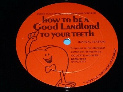 Being offered is a copy of "How To Be A Good Landlord To Your Teeth", a Colgate toothbrushing instruction 33 1/3 rpm 10" record. Still in it;s original mailing box. Box is in EX condition. Vinyl is VG+ with some smudges. Paper sleeve shows wear, with numerous bends and tears. Please be advised that condition grading is being done on a conservative visual basis, as this record album has not been played. Thanks for looking! Cover - EX- (original white cardboard mailing box) Vinyl - VG+ (some smudges) NOTICE: Due to the current conditions, the Post Office is falling behind in the processing and shipping of the mail. Tracking information and shipping updates are delinquent or nonexistent. Please be advised that there can be extended delays, sometimes lasting many days beyond any proposed delivery date posted in the item description. Efforts are being made to find alternative shipping methods while still trying to remain cost efficient. Thank you for your understanding with this matter and purchase accordingly, knowing that I have no control over when the Post Office delivers the mail. Thank you for your business. Sarge