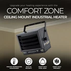 Finished in a sleek charcoal gray, this robust 6,000-watt unit is designed to thrive in even the harshest environments Count on the Comfort Zone Ceiling Mount Industrial Heater for dependable, efficient heating in any workspace. FEATURES Ceiling-mount heater with 2 heat settings and precise temperature management with digital thermostat, remote control, and digital display Stay protected with built-in security measures including overheat protection and fan shut-off delay for peace of mind during operation Designed for longevity, featuring a heavy-duty steel body and fully enclosed motor to withstand harsh conditions Adjust the louvers and installation angle to direct heat precisely where you need it for optimal comfort Suitable for high-demand industrial and commercial environments, with compatibility for low 208-volt power for versatility of use Material: Steel Color: Black Dimensions (L x W x H): 16 x 10.75 x 21.25 inches Weight: 27.12 pounds SPECIFICATIONS Brand: comfort zone Color: Black Country/Region of Manufacture: Unknown Features: Auto Shut-off Item Depth: 16 in Item Length: 16 in Item Width: 10.75 in Material: Steel MPN: TV-106101 Number of Heat Settings: 2 Power: Greater Than 5000 W Timer Control: 12 hrs Voltage: 208/480 V BTU Heating Rating: 20000-24999 BTU Control Style: Digital Heating Element Material: Steel Mounting Location: Floor Type: Portable Heater Questions about this item? Click here to contact us! With 2 heat settings, achieving your desired level of comfort is effortless. Equipped with advanced features such as a digital thermostat, remote control, and digital display, managing your heating preferences has never been easier or more precise Product Description Comfort Zone Ceiling Mount Industrial Heater with 2 Settings and Thermostat Upgrade your heating experience with the Comfort Zone Ceiling Mount Industrial Heater With features like the overheat protection system and fan shut-off delay, you can rest assured that your workspace is protected from potential hazards.