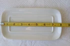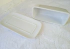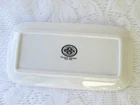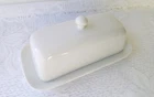 CORDON BLEU White Ceramic Butter Dish with Lid Measures approximately 8" length, 4 1/4" wide and about 3 1/2" tall with lid Overall very nice condition with no chips or cracks detected. There is a slight discoloration spot found on the platter edge (please see last picture). Packed with Care and Ready to Ship