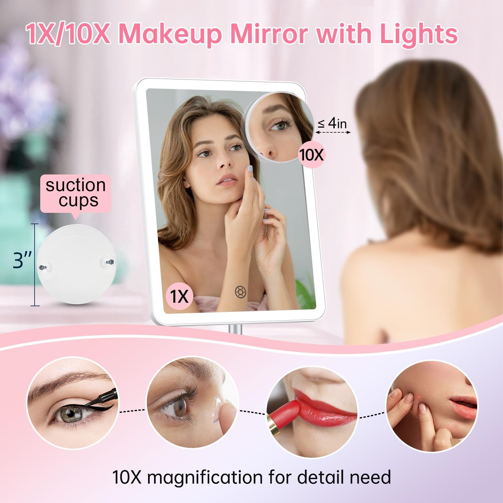 COSMIRROR Makeup Mirror with Lights,Lighted Makeup Mirror with 10x Magnifying,Rechargeable Led Light up Makeup Mirror,Vanity Travel Mirror with 3 Color Light,Touch Screen 360°Rotation Desk Mirror Product Details Brand: COSMIRROR Room Type: Bathroom, Dressing Room, Bedroom, Home Office Shape: Rectangular Product Dimensions: 13.6"L x 7.6"W Frame Material: Acrylonitrile Butadiene Styrene (ABS) Brand: COSMIRROR Room Type: Bathroom, Dressing Room, Bedroom, Home Office Shape: Rectangular Product Dimensions: 13.6"L x 7.6"W Frame Material: Acrylonitrile Butadiene Styrene (ABS) Style: Modern Mounting Type: Dresser Mount Finish Type: Painted Surface Recommendation: Plastic Special Feature: 360 Degree, Makeup, Color Changing, USB Charging, Magnifying Color: White Theme: Gift, Beauty, Makeup Specific Uses For Product: Dressing, Home Decor, Makeup, Shower Number of Pieces: 1 Number of Items: 1 Material: Stainless Steel, Glass, Acrylonitrile Butadiene Styrene Frame Type: Framed Assembly Required: Yes Frame Color: White Magnification Maximum: 10 x Manufacturer: COSMIRROR Has Smart Features: No Frame Size: 13.6 x 7.6 inches Size: 13.6"L x 7.6"W Item Weight: 1.63 pounds Country of Origin: China Item model number: Makeup Mirror-435 Date First Available: June 21, 2024 Rechargable 2000mAh BatteryBuilt-in 84 pcs brighter LED Bulbs and 2000mAh energy-saving lithium Battery mirror for makeup work time lasting for 8-10 hours in a fully charged state.(No Battery Replace Needed) 3 Light Color & Adjustable Light BrightnessCOSMIRROR makeup vanity mirror with lights feature 3 Light Color: White Light, Natural Light and Warm Light. Short-pressing the mirror surface switch button could adjust the Light Color. Long-pressing will adjust the Brightness from Dark to Bright. 1X Mirror & Detachable 10X MagnificationUpdated led makeup mirror with 7.5*9.5 inch size and HD Mirror Surface with wider viewing. Lighted Makeup Mirror with detachable 10X magnification, which view every details clearly when apply eyeliner, eyebrows, mascara, lipstick, etc. (Note: Please keep your eyes within 4 inches away from the mirror to avoid feeling DIZZY.) 360-Degree Rotation & Suitable Stand Height360 Rotatable and 62 Up to Down, meeting any angles you need and bring you best makeup exerpience. Stand up makeup mirror for desk designed with an ideal height, NOT NEED TO BEND OVER while applying makeup. Sturdy and Stable stainless steel Stand, prevent any Wobbling during makeup. Solid and Well-balanced Base, providing Firm Support to keep the table top makeup mirror securely in place. Ideal GiftStylish, Lightweight design and practical features, this light up cosmetic mirror makes an excellent GIFT for Holidays, Birthdays, Mother's Day, Valentine's Day or Christmas gift for You, Friends, Lover or Family. Any doubts or problems of this make up mirror with lighting, feel free to tell us to help you.