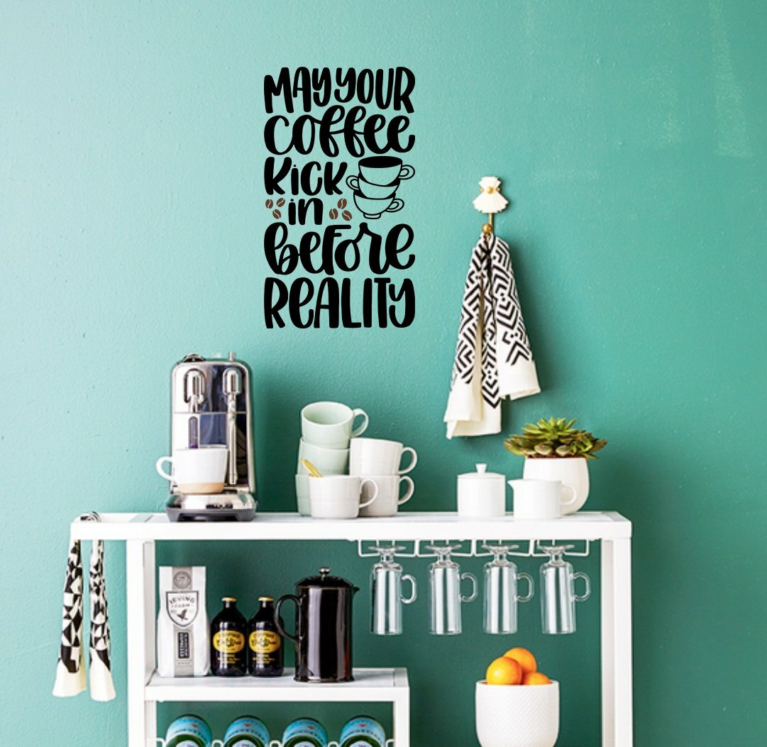 May Your Coffee Kick In Before Reality wall Decal Vinyl For Coffee Shop Bar Wall Graphic Decal Decor Vinyl Sticker ✅ At this time, I am listing this decal with black or white option. I have various color options listed in the photos. (☞ ͡° ͜ʖ ͡°)☞ If you prefer a different color other then black or white, please let me know when ordering. ✅ There are 2 different sizes to chose from. If these sizes do not work for you, please contact us. 💕 We will do our best to cut the size you need. Prices may vary. ✅ Vinyl wall decals are the latest trend in home decor. They are an inexpensive way to add style and personalize any room in your home. They are easy to apply and can be removed without any damage to the wall. Please a decal is removed, it cannot be reapplied. This decal would make an excellent gift for the one person that is so hard to buy for. Also would be a great wedding gift or house warming gift! To sum it up... (☞ ͡° ͜ʖ ͡°)☞. Our vinyl is high quality premiere US vinyl. (☞ ͡° ͜ʖ ͡°)☞. Your wall decal will be made to fit any clean, smooth, flat, light-textured surface. (☞ ͡° ͜ʖ ͡°)☞. Decals are fully removable but not reusable. (☞ ͡° ͜ʖ ͡°)☞. The decal is one solid vinyl color unless stated otherwise. The color of background is going to be a color of your surface which it is applied to. (☞ ͡° ͜ʖ ͡°)☞. Our products are made in USA. (☞ ͡° ͜ʖ ͡°)☞. Each and every decal is made to order. (☞ ͡° ͜ʖ ͡°)☞. We can customize all of our decals for free. If you have questions or concerns, please reach out to us via the “contact seller” button. (☞ ͡° ͜ʖ ͡°)☞. The vinyl quote displayed in the picture is for the purpose of showing the details of the lettering. It is not for representing the size of the quote in comparison to props, furniture, etc. and may be enlarged to show details. 🥰 We have other home decor items for a variety of uses and we are always adding more items regularly. Please favor ❤️ our store so you don’t miss out on any new listings! If you would like something custom or would like to order a large quantity of a certain item, please feel free to contact me for details. VISIT OUR SHOP: