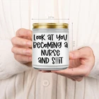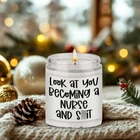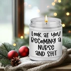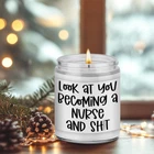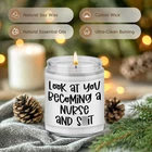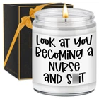 Gifts for nurses; Printed with funny saying "Look at you becoming a nurse and s," our candle makes great gifts for your nurse friend, school nurse, nursing student, labor and delivery nurse, nurse graduate, future nurse, new nurse, retired nurse, nurse preceptor, registered nurse, pediatric nurse, oncology nurse, nurse manager, instructor, assistant, female or male nurse in your life who deserves something special Suitable for various occasions; Funny nurse gifts for birthday, mothers day, nurse graduation gifts for women, nurse retirement gifts, nurses week gifts, nurses day gifts, nurse appreciation gifts, nurse thank you gifts, cool gifts for nurses, congratulations gifts, nurse Christmas gifts, stocking stuffers, holiday gifts, or just because gifts for nurses Three scents to choose from; Earthy, spirit-lifting lavender has a floral, and woodsy scent that is known for its calming and soothing properties; Sage & lavender is the ultimate calming scent that balances mind and spirit; Congrats is a captivating scent blend of sweet and fruity notes, great for celebrating achievements Natural relaxation experience; Made from natural wax and scented with natural essential oils, our scented candle burns longer and cleaner, filling your space with a delightful and natural fragrance; Ideal for body relaxation and Long-lasting burning; With a burning time of up to 50 hours, our scented candle, made with a cotton wick, allows someone you care about to light it up longer; Give them this candle that will always remind them of you