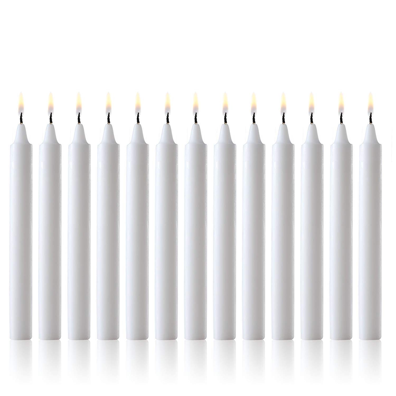 Set of 60 White Taper Candles: 4 inch Tall x 0.5 Inch Thick. Burn Time up to 1.5 Hours. Color is core and overdip maintain color throughout burning. 100% lead free wick Dripless and unscented Clean Burn Perfect Chime Candles Taper Candles add elegance and sophistication to any formal event. Whether it be at a wedding, a reception table or just for a romantic candlelit dinner for that special someone. They provide just the right amount of textured lighting for a dramatic presentation. Small Tapers make the perfect tabletop light for upscale restaurants and parties. Those mini taper candles are perfect decoration for a Christmas Tree, charismas caroling or Holiday Season. They will fit to your angel chimes, pyramids and many others candle holders. Often used on a birthday parties as a birthday cake decoration. SET OF 60 white dripless taper candles 4 Inch tall and 1/2 inch diameter. HAND DIPPED with quality wax to maintain color throughout burning. Contain 100% lead free wick USE perfect as a casting chimes candles candles, vigil, christmas eve, candles, wax play candles. FIT mini taper candles fit into any angel chime, menorah, candle holders with 0.5 inch diameter holder. UNSCENTED and SMOKELESS with pure white clean 1.5 hour burn time. Perfect for church dinners, weddings, parties and other special occasions.