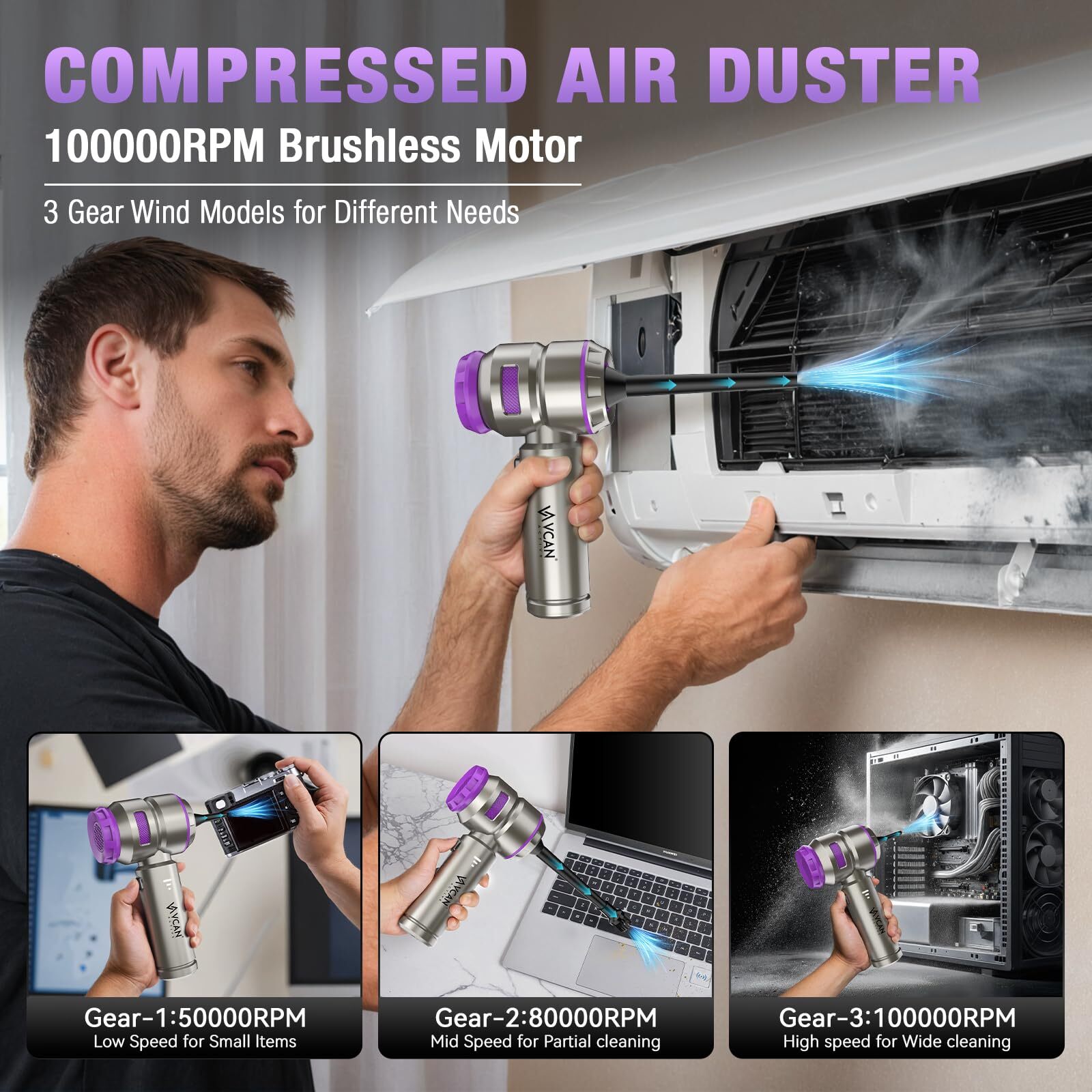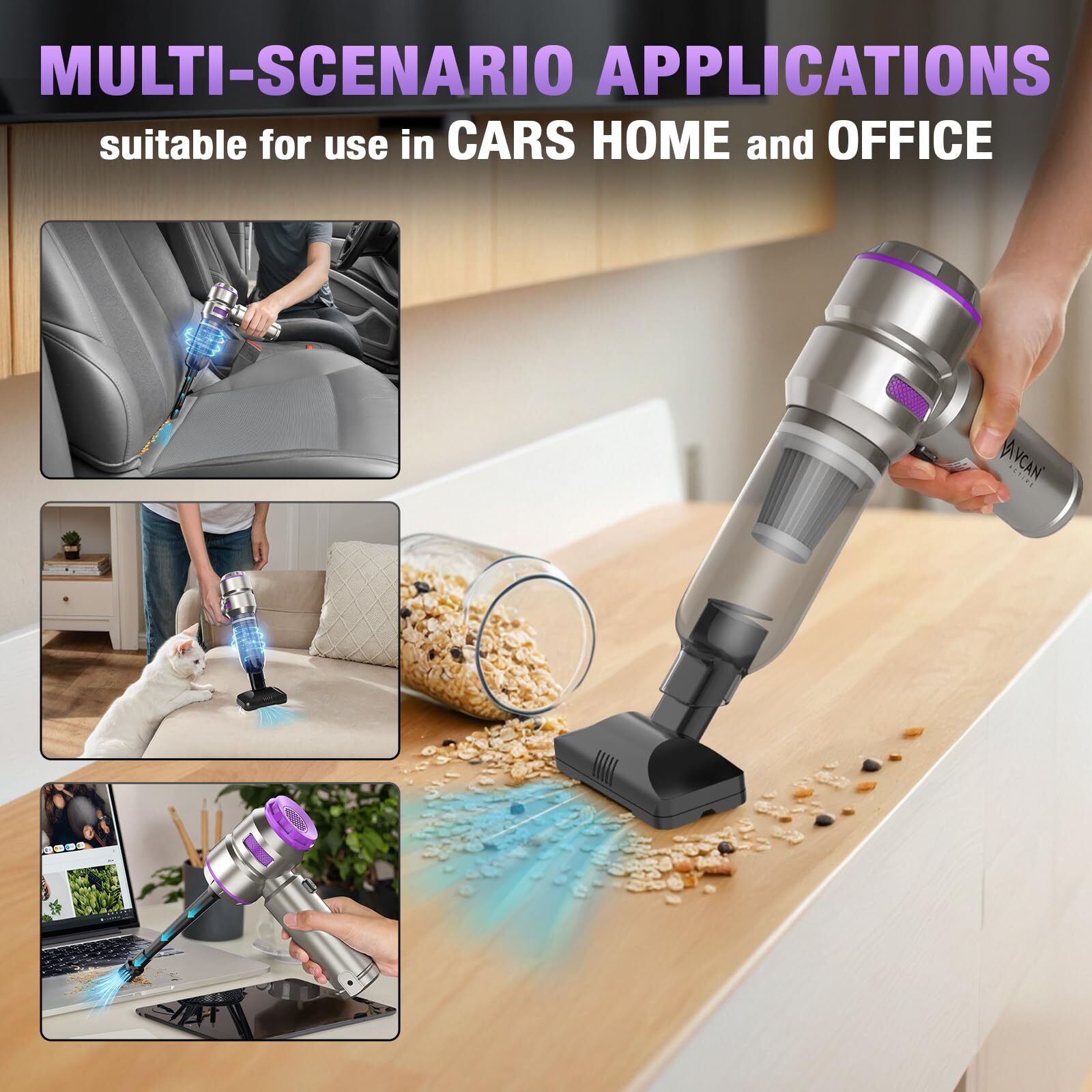 đă4 IN 1 Car Vacuum Cleanerăcar vacuum portable cordless integrates Vacuum Cleaner, Air Duster, Air Pump and Air Extractor's functions in one device. With its Complete range of accessories,you can easy tackles crumbs, pet hair, and dust in carpets, upholstery, narrow spaces, and crevices like computer keyboards and mainframes.Enjoy the convenience of a single versatile device. You can also use the compressed air duster to inflate the swimming ring or air bed. đ ă18000PA &100000RPM high power handheld vacuumăcar vacuums with best suction cordless boasts an enhanced high-speed brushless motor. Its dual-turbine blade configuration operates at speeds of up to 100000 r/min. .The 3 adjustable suction power modes of 9000PA, 13000PA and 18000PA. This handheld car aspiradora para carro quickly and effortlessly picks up dirt and hair from your car's interior, leaving it spotless and fresh. đă7500mAh Rechargeable Battery & Type C Chargingă wireless handheld car vacuum cordless can be can quickly fully charge in 2-3 hours, offering up to 40 minutes runtime. You can conveniently charge the vacuum in your car or any other location Type C charging. The green indicator on the cable serves as a timely reminder once the power reaches a full charge and a power reminder setting on the button ensures you're promptly informed to recharge the machine when needed. đăPORTABLE, COMPACTïŒLightweight & WASHABLEăMini Vacuum Cleaner for Car boasts a compact, only 0.8lb and compact in size. Its lightweight construction allows effortless maneuverability around the house and car, ensuring your car stays clean and tidy. Store this small vacuum cleaner Portable conveniently in the trunk or closet for quick access. Additionally, its reusable Fine steel filter and HEPA filter are washable and air-dried, ensuring lasting functionality. đWashable Filter: Designed for durability,our small vacuum cleaner cordless features a reusable,washable filter (1pc steel filter and 2 pcs HEPA filter).Easily detach and clean the filter for long-lasting performance, ensuring a fresh environment for you