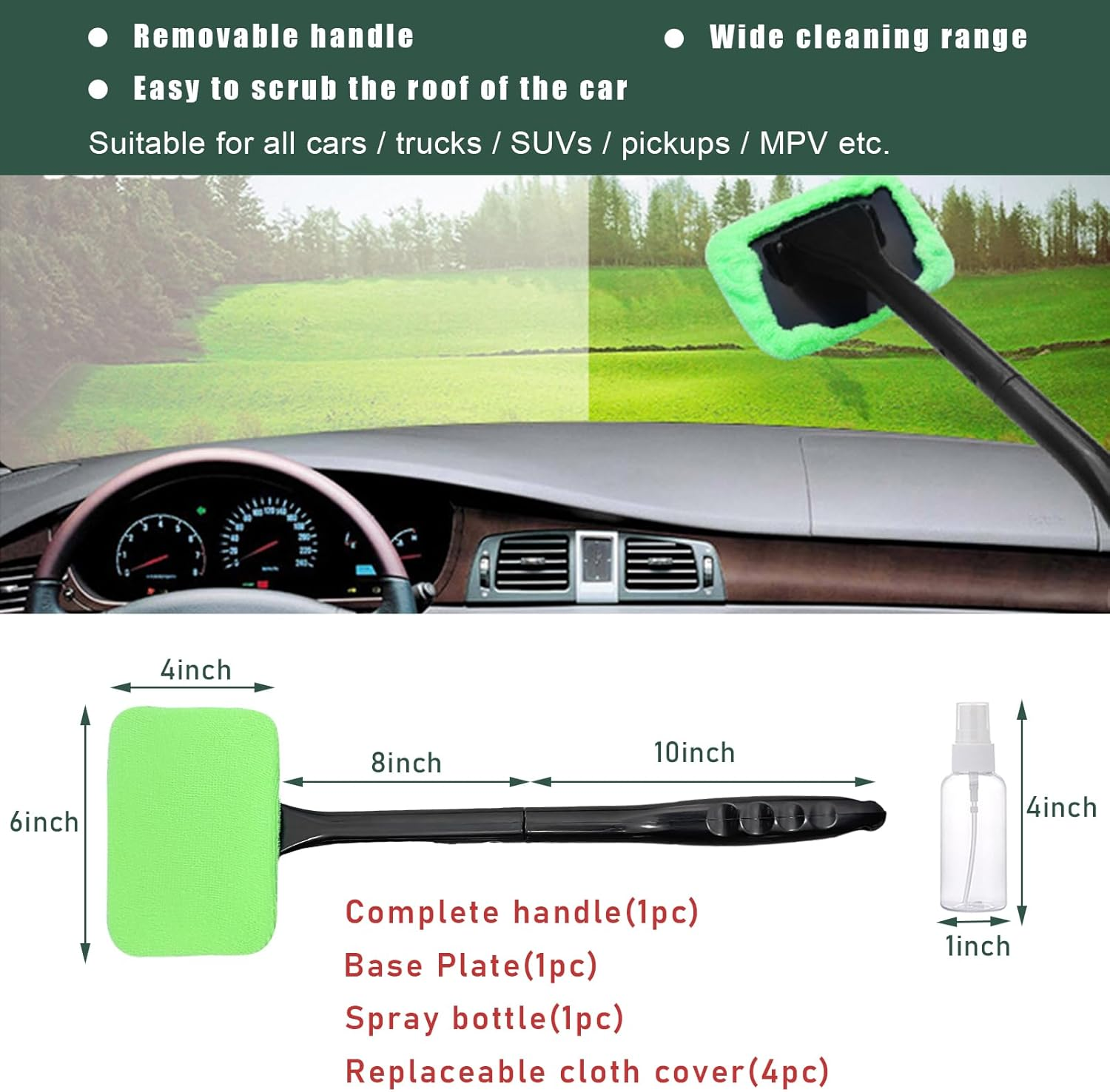 Car Windshield Cleaning Tool, Microfiber Window Cleaner Set with 4 Washable and Reusable Cloth Pad Head, Detachable & Unbreakable Handle and Spray Bottle, Universal Car Glass Cleaner Kit 【High Quality】: The handle of the windscreen cleaner is made of high quality ABS material, which is hard, firm and not easy to rust. The microfibre cloth padded head is made of highly absorbent fabric and can be washed again and again. It leaves no streak residue, no scratches and no lint, resulting in impressive results. 【Excellent Function】: The handle of the car window cleaning tool is sturdy and ergonomic. It easily cleans the entire car windscreen, reaching into the bottom of hard-to-reach windows. It uses a snap-fastening method to make the handle firm and secure. Compared to many car wash mops on the market, it won't retract randomly and won't scratch your car. 【Rotating Design】: This car defogging dust brush is designed with a square head that can rotate 180 degrees. It can make full contact with the glass and easily clean the bottom of the car window or some hard-to-reach areas. Together with the non-slip design of the handle, you can easily control the cleaning brush to make cleaning more convenient. 【Easy to Carry】: This car dusting brush comes with 4 cloth pads, 1 handle and 1 spray bottle. The cloth pads are long-lasting, soft and easy to clean. The handle is detachable, you can use it after assembling the handle, and it's also convenient for you to carry and store it in daily use when you don't need it. 【Wide Application】: This windscreen cleaner is great defogging and dusting tool for all sizes of cars, trucks, SUVs and motorhomes. It can also be used not only for car window cleaning services but also for home and office cleaning services. You can use it to clean houses including windows, monitors, kitchen walls, bathroom mirrors and more. Product Description Item Form Spray Manufacturer Part Number -591CT Package Dimensions 10.75 x 4.76 x 1.77 inches Item Weight 7.6 ounces Material Feature Unbreakable Scent No Specific Uses For Product Automotive Exterior 4.76 inches x 10.75 inches x 1.77 inches. Weight: 7.6 oz Shipping from the USA All of our products are shipped from the USA, ensuring quick delivery to your destination. Payment We offer the following payment methods: PayPal, credit card, bank transfer, and eBay's secure payment system. Free Shipping & Free Returns Shipping within the USA is FREE. Additionally, any return is absolutely free for you. Risk-Free Purchase You have the option to return an item within 30 days without any justification. We cover the return shipping costs! Fast Shipping We ship immediately upon receipt of payment. Generally, the package is delivered within 2-3 days in the USA. If it takes longer, we will contact you. Quality and Costs Made in Europe, USA, China No customs fees or additional charges Total satisfaction guarantee Invoice with declared VAT available upon request in .pdf format Feedback Your feedback is very important to us. After you pay for your purchase, you will automatically receive positive feedback from us.