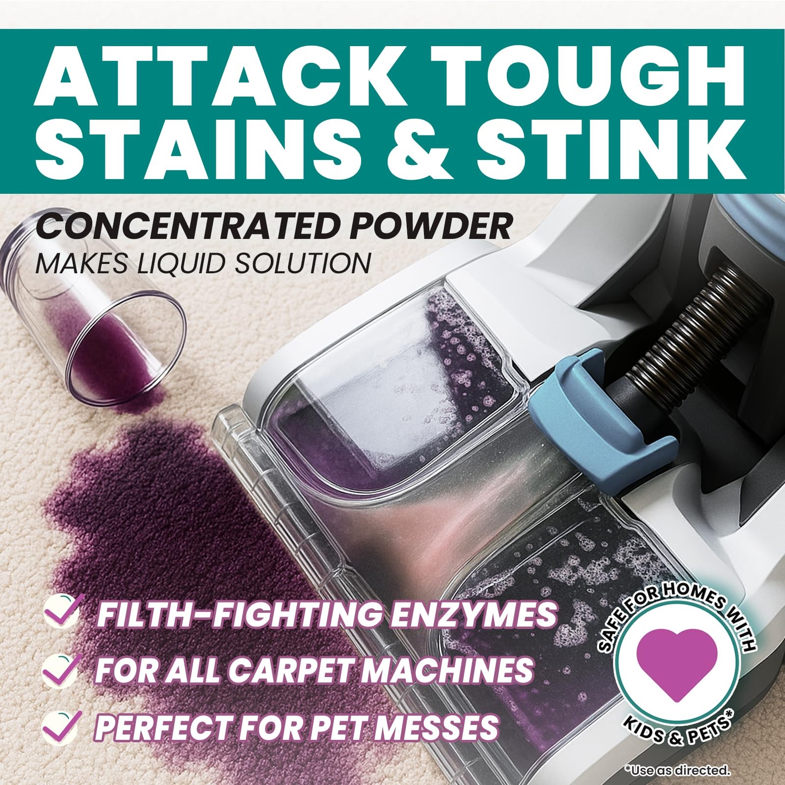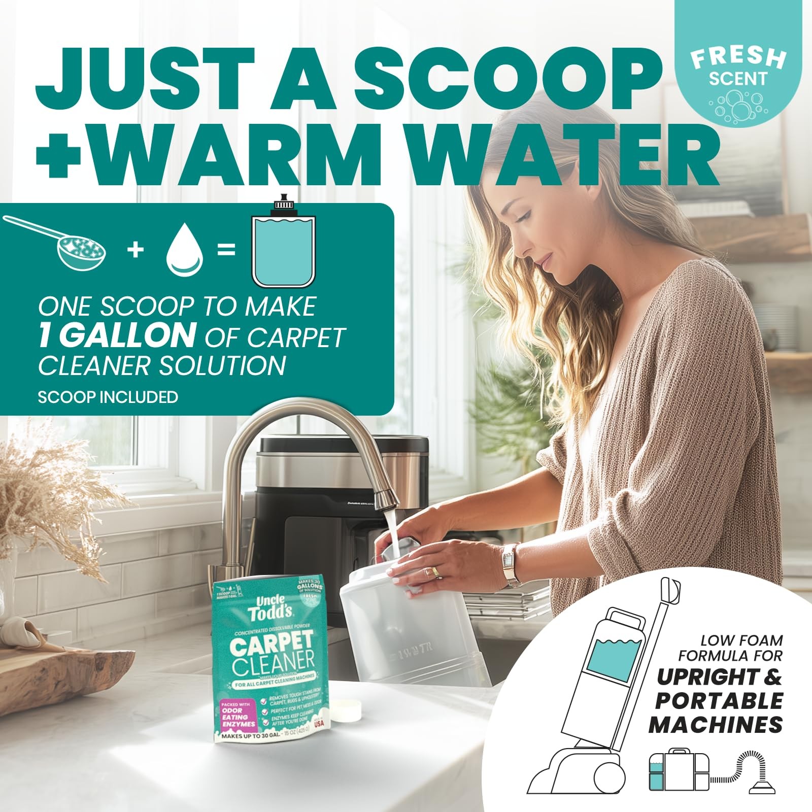 Uncle Todd’s Carpet Cleaner Powder is a concentrated, bio-enzymatic cleaning formula designed for deep cleaning and odor removal across all carpet and upholstery types. Each scoop mixes with warm water to create a powerful yet gentle cleaning solution that attacks pet messes, spills, and grime at the molecular level — not just masking odors, but eliminating them. The result: soft, fresh carpets that look and smell like new. Formulated with active enzymes, Uncle Todd’s continues to work even after you’re done cleaning, breaking down residues that cause odors to return. Compatible with all carpet cleaning machines (upright, portable, or spot), this plant-based powder is safe for homes with kids and pets, and packed in a recyclable resealable pouch for easy storage and less environmental impact. Trusted by cleaning pros. Loved by pet parents. Powered by enzymes. Attack Tough Stains & Stink: Enzyme-powered concentrated powder turns into a high-performance liquid cleaning solution. Cuts through pet messes, spills, and mystery smells fast. Use with Any Machine: Compatible with all upright and portable carpet cleaning machines — Hoover, Bissell, Rug Doctor & more. Dissolves completely for smooth, low-foam cleaning. Active Enzymes Keep Working: Continues breaking down odor-causing residues long after cleaning, helping carpets stay fresh longer. Safe on All Carpet Types: Effective on nylon, polyester, wool, and stain-resistant carpets. Non-bleaching, septic-safe, and free from harsh chemicals or strong fragrances. Big Clean, Small Footprint: Lightweight, portable powder replaces bulky jugs. One 15-oz pouch makes up to 30 gallons of ready-to-use solution — less plastic, less waste, more clean.