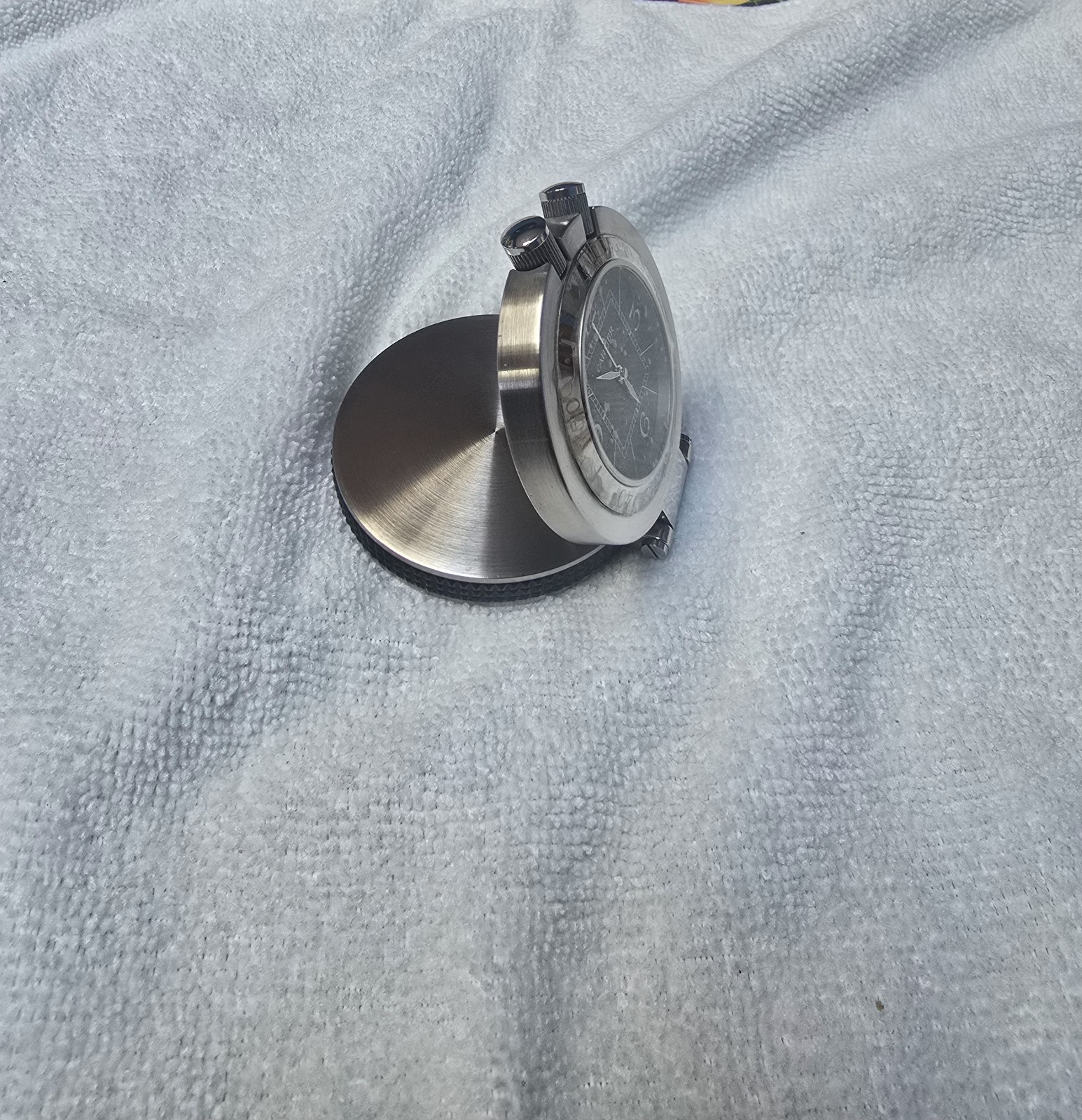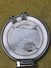 The Cartier Pasha Timer Travel Clock Pocket Clock is a vintage-inspired piece with a sleek stainless steel construction in a silver color. This battery-powered quartz clock features an analog display and alarm function, making it both functional and stylish. As an original Cartier model, this clock exudes luxury and sophistication, perfect for collectors or those looking to add a touch of elegance to their décor. The 21st-century design adds a modern twist to this classic timepiece, making it a unique and eye-catching addition to any collection.