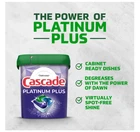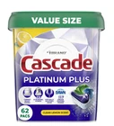 About this item Our best dishwasher detergent for cabinet ready dishes Only Cascade Platinum Plus contains 2X* the Dawn grease fighting power and 2X* the scrubbing power to power through dried on food *Cleaning ingredients vs Cascade Complete ActionPacs Get virtually spotfree sparkling clean dishes on even the toughest messes 40% larger liquid top for even more* cleaning power that still fits in your dishwasher detergent dispenser *vs Cascade Platinum ActionPacs Running the dishwasher daily saves water* Save up to 20 gallons of water per dishwasher load when you skip the pre-wash *ENERGY STAR certified dishwashers use 4 gallons per cycle. Running the tap for 11 minutes handwashing uses up to 24 gallons of water. #1 Recommended Brand in North America* *More dishwasher brands in North America recommend Cascade based on co-marketing agreements vs. other automatic dishwasher detergent brands Formulated to help prevent hard water spots and filming to keep your machine looking fresh and clean Lemon, 62 Count