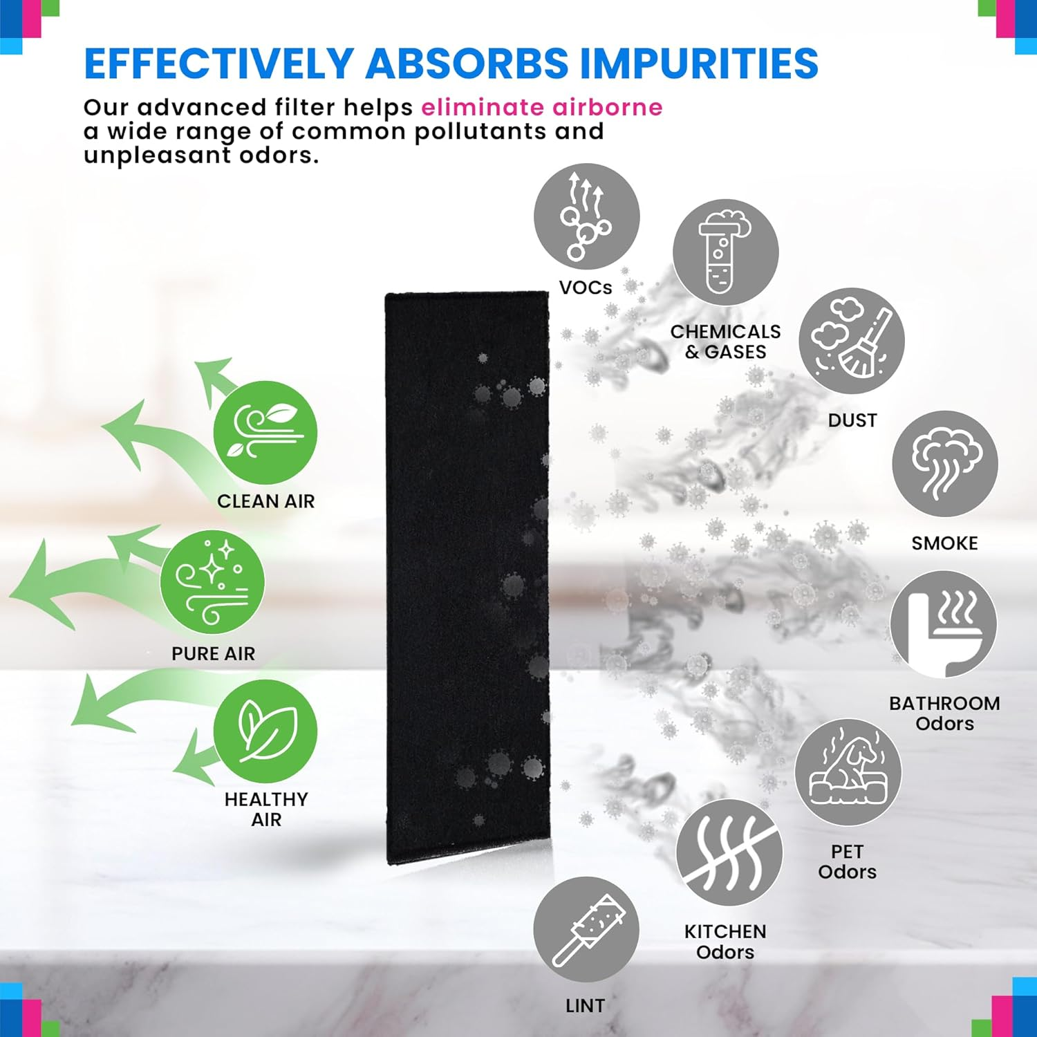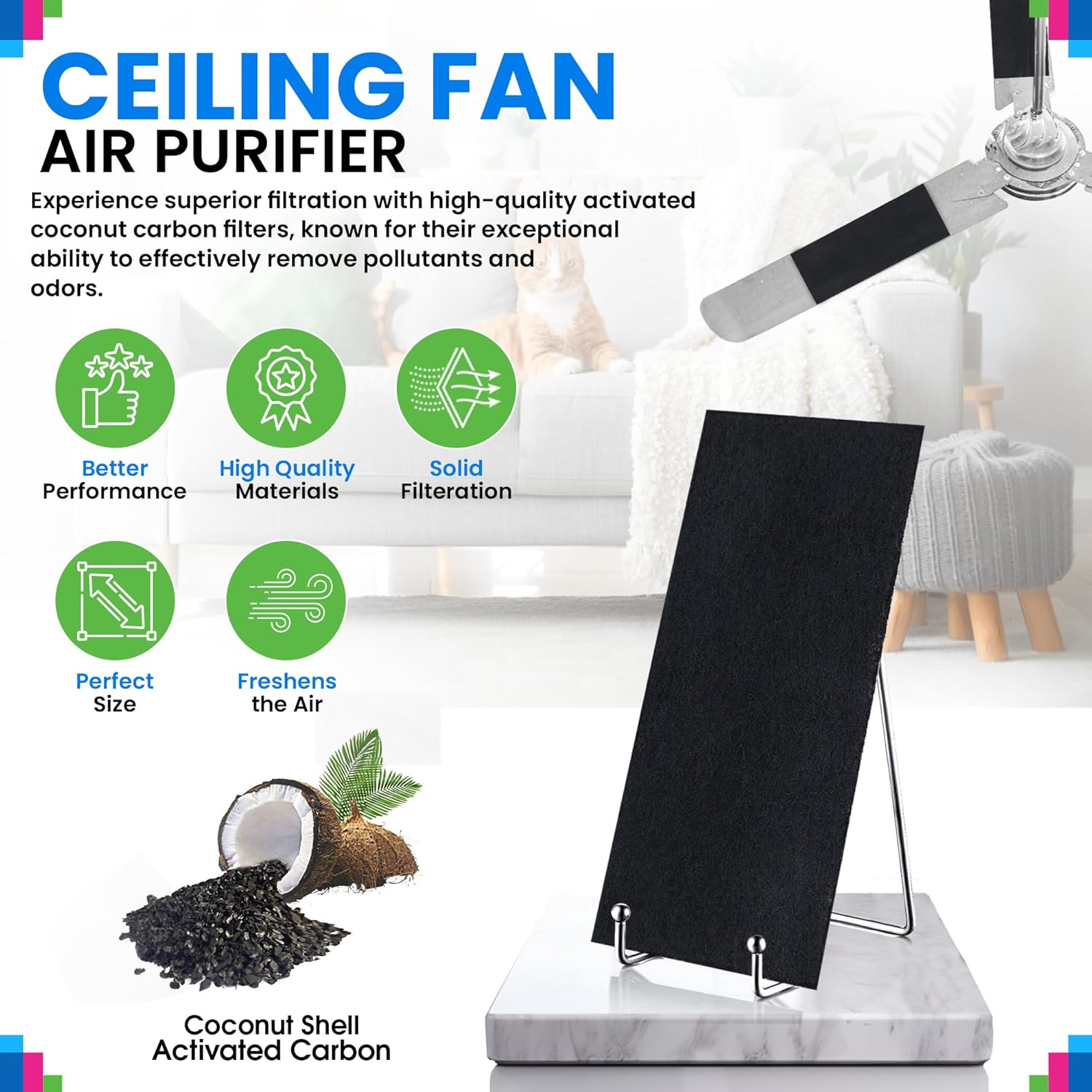 Ceiling Fan Filters for Blades - Coconut Shell Activated Carbon Unscented Dust Catcher Ceiling Fan Filter - Easy Peel & Stick on Fans - Blade Air Purifier Pads Removes Odors & Freshens the Air (3-Pcs) FRESHEN THE AIR: This ceiling fan filters for blades will turn your ceiling fan into an air quality enhancer - They freshen the air from common household contaminants ensuring an inviting atmosphere ULTRA ABSORBENT: Crafted from highly absorbent coconut shell activated carbon this ceiling fan filter ensures top performance in absorbing odors and unpleasant smells ENHANCED ODOR ELIMINATION: We enhanced these fan filters for ceiling fan blades with extra carbon to provide exceptional odor absorption outperforming other ceiling fan air filters for blades EASY INSTALLATION: Includes convenient reusable sticky hook & loop - Simply peel and stick the ceiling fan air purifier pads and reuse the hook & loop when you replace the ceiling fan blade filters PERFECT FIT: These fan blade air purifier pads dimensions are 3.5" x 10" making them compatible with most ceiling fans - For optimal performance use the ceiling fan air filter on all blades REPLACE QUARTERLY: Change the ceiling fan dust catcher every 2-3 months to maintain optimal performance ensuring effective odor absorption and efficient filtration TRUST THE BEST: With over a decade of experience in all types of filters and a reputation for customer satisfaction our filters have become the brand of choice Product Description Shop Our Other Carbon Filters Add to Cart Add to Cart Add to Cart Add to Cart Add to Cart Add to Cart Add to Cart Customer Reviews 4.0 out of 5 stars 13 4.5 out of 5 stars 39 4.7 out of 5 stars 5 4.7 out of 5 stars 10 3.7 out of 5 stars 8 4.4 out of 5 stars 22 4.6 out of 5 stars 15 Price $8.78 $ 8 . 78 $15.93 $ 15 . 93 $12.98 $ 12 . 98 $17.69 $ 17 . 69 $22.98 $ 22 . 98 $11.48 $ 11 . 48 $19.98 $ 19 . 98 Material Activated Carbon Activated Carbon Activated Carbon Activated Carbon Activated Carbon Activated Carbon Activated Carbon Compatible Devices Ceiling Fans Air Purifier, Vents, AC, More Air Purifier, Vents, AC, More Air Purifier Air Purifier Air Purifier Air Purifier Fits models Most popular brands Cut to fit most models Cut to fit most models Honeywell HPA300 Honeywell HPA200 Honeywell HPA100 Honeywell 50250-S Size 10" x 3.5" 16" x 48" 6" x 48" 17.3" x 14.2" 13.9" x 11.2" 10.7" x 7.36" 10" x 48" Easy To Cut ✔ ✔ ✔ ✔ ✔ ✔ ✔ Item model number Fan Filter (3Pcs) Item Package Quantity 1 Batteries Required? No Color Black Product Dimensions 10 x 3.5 x 0.2 inches Country of Origin USA Item Weight 1.13 ounces Model Fan Filter (3Pcs) Included Components Carbon Filters Shipping We offer FREE shipping on all orders! Under normal circumstances, we try to ship all orders within three business days of payment, normally sooner. We use a selection of shipping services such as UPS, FedEx, USPS, etc We only ship to the lower 48 states, we do not ship to Alaska/Hawaii, US Protectorates, Puerto Rico, and PO Boxes. Local pickups and combined shipping options are not available at this time. Returns and payment Although we strive for 100% order fulfillment accuracy, mistakes happen. Please allow us to correct any error before leaving us negative feedback. We are confident in our products, but if you are not fully satisfied with your order, please contact us within 30 days of purchase, and we will send you a return label. Once the item is returned we will issue you a full refund. The product must be returned in the original item's box, and the same condition as you received it. We accept payment only on eBay Payments (We accept all kinds of credit cards) Please pay as soon as possible after winning an auction, this will allow us to ship your item sooner! FeedBack Your feedback very important to us, after you get your package and you are satisfied with our service please leave us positive feedback If you have any problem with your order / any questions please contact us, before leave any type of feedback If you have any questions, please don't hesitate to contact us. Please allow us 24 hours to respond, although normally we respond sooner. Please visit our eBay store to check out other items for sale! Thank you for shopping at our store.