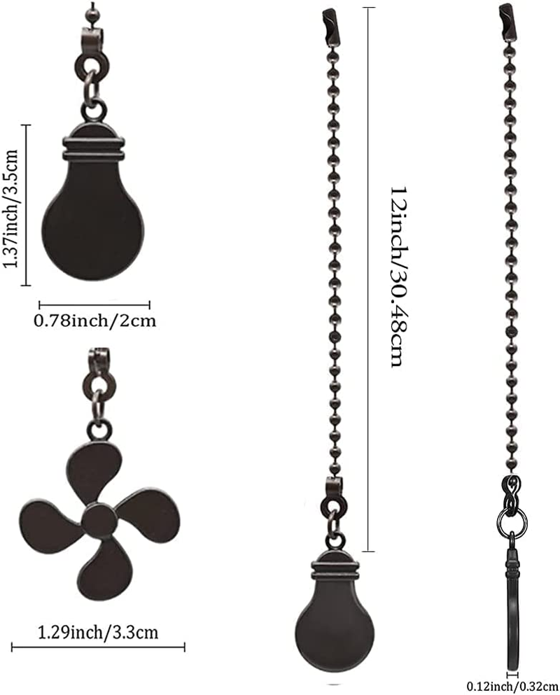 Ceiling Fan Chain Extender Light Pull Chain Set, 12 Inch Ornaments Extension Chains with Decorative Light Bulb and Fan Cord for Ceiling Light Lamp Fan Chain,Black Copper Fan and bulb design, they will easily help us recognize which switch controls, and easy for our daily use. 2 Pieces Ceiling Fan Pull Chain. High quality material, all copper material makes this fan pull chain extender much more durable and rust-proof. Wide application, the ceiling fan pull chain set is apply to ceiling fan, light fixtures, on the ceiling for ventilation and other occasions. Ceiling Fan Chain Pulls will beautify the interior environment for your home, will bring you Good Luck with different Pattern. If you have any quality problems, please contact us, we will definitely return or exchange the goods. Product Description Fan and light pull chain set helps you quickly identify which is the fan and which is the light switch. The chain length is 12 inches, so you don't have to stand on tiptoe to pull it, and the chain can be cut according to your preferences. We have a lot of ceiling fan pull chains styles in our Akahttbn store, welcome to buy!