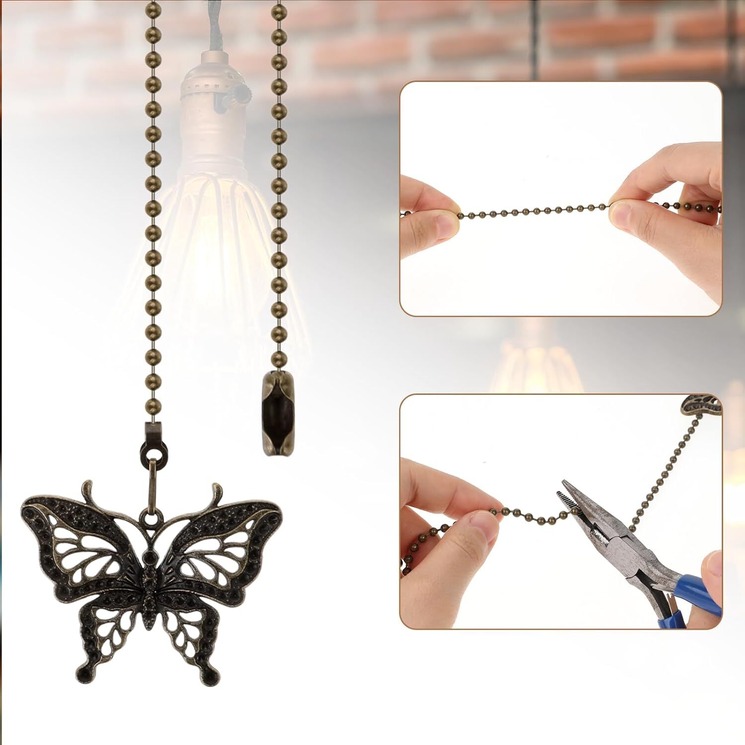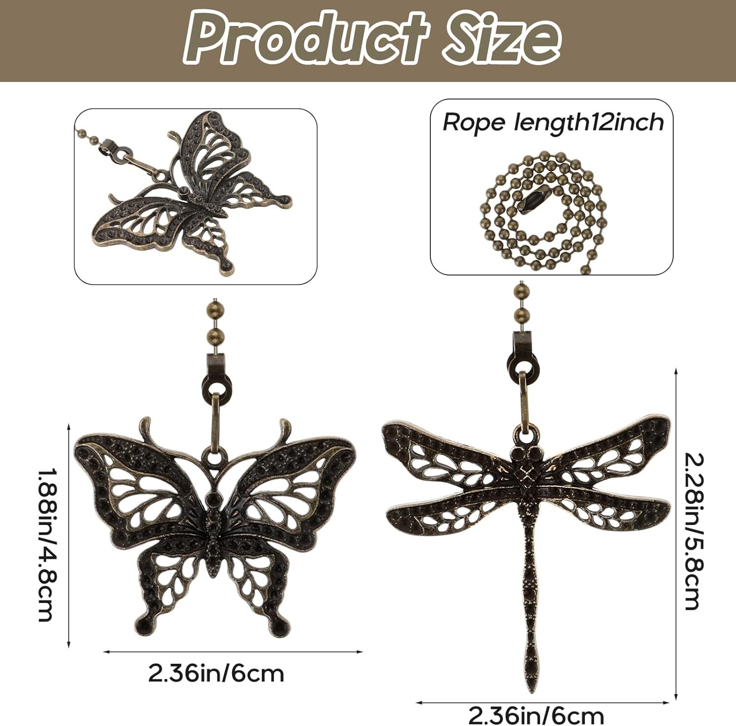 Ceiling Fan Pull Chain Extender 12 Inches Lighting Fan Chain Pendant Extension Dragonfly Butterfly Decorative Light Fan String Pulls Charm Extender Ornaments for Fan Lamp Product Details Manufacturer: Hariendny Part Number: 580734_1_FnYJTPHj Item Weight: 1.23 ounces Product Dimensions: 13.78 x 2.4 x 0.16 inches Country of Origin: China Item model number: 580734_1_INxQm66XS Shape: Butterfly Batteries Required?: No 【Reliable Materials】These retro light chain pull extender are made of high-quality stainless steel, which is more durable and not easy to rust. 【Exquisite Design】fan pull chain extension adopts retro hollow design, and designs into the shape of bees and butterflies, which looks charming and realistic, and is suitable for all kinds of ceiling fans, making your home decoration more beautiful. 【Retro Style】These ceiling fan pull chain have a delicate bronze color and look beautiful and retro. Decorate your house with these pendants to create a retro feeling, thus showing your personality and taste. 【Easy to Use】With the fan pulls decorative, you don't need to stand on tiptoe to turn on the light or adjust the speed of the fan. There are two different decorative pendants, and you will easily know which is the fan switch and which is the light switch. 【Widely Used】Fan pull chain extension is suitable for ceiling fans, ceiling lamps, bedside lamps and other occasions. They can be used to replace broken fan pendants and are very suitable for home decoration DESCRIPTION:Material: stainless steelProduct size: Butterfly: 35 * 6.1 * 0.4; Dragonfly: 38 * 6 * 0.38cm.PACKING LIST: 2*Ceiling Fan Pull Chain Extender
