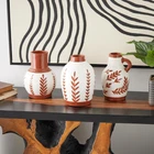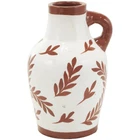 The Tuscan set of 3 vases for home decor showcases meticulous craftsmanship, each molded into a distinct shape and uniquely painted. The round shape and leaf designs of these polished white vases for faux flowers offers a classic and timeless look, while vase has a little handle for added charm. Wipe clean with a dry cloth. Style the floral set of 3 centerpiece vases together as a cluster on a dining table or separately in different areas of the home, enhancing visual appeal. Designed with felt or rubber stoppers at the base that prevent scratching furniture and table tops, as well as sliding around. This item ships in 1 carton. Ceramic vase makes a great gift for any occasion. Suitable for indoor use only. This item ships fully assembled in piece. Made in India. This white colored ceramic vase comes as a set of 3. Tuscan style. Vases have 2.50 in, 1.80 in, and 1.50 in mouth openings. TUSCAN HOME DÉCOR VASES: Immerse yourself in the harmony and beauty of pieces that unite natural textures with ornate details to create that Old World charm CERAMIC VASES FOR CENTERPIECE: Crafted from high-quality terracotta, this white decorative vase set ensures longevity and a polished aesthetic WHITE VASES FOR FLOWERS: This round home decor vases set showcases a soft and soothing terracotta brown with a polished finish over a background of white, adding a touch of freshness to the home FLORAL ROUND VASES FOR HOME DÉCOR: This ceramic set of 3 vases offers a variety of patterns, perfect for creating stunning dried floral arrangements or unique individual display 3 SMALL SIZE FLOWER VASES CENTERPIECE: Each white ceramic vase measures 6.35L x 6.35W x 8.8H , 5.35L x 5.3W x 8.85H, 6.1L x 6.2W x 9.05H inches, and collectively weighs 10.93 lbs