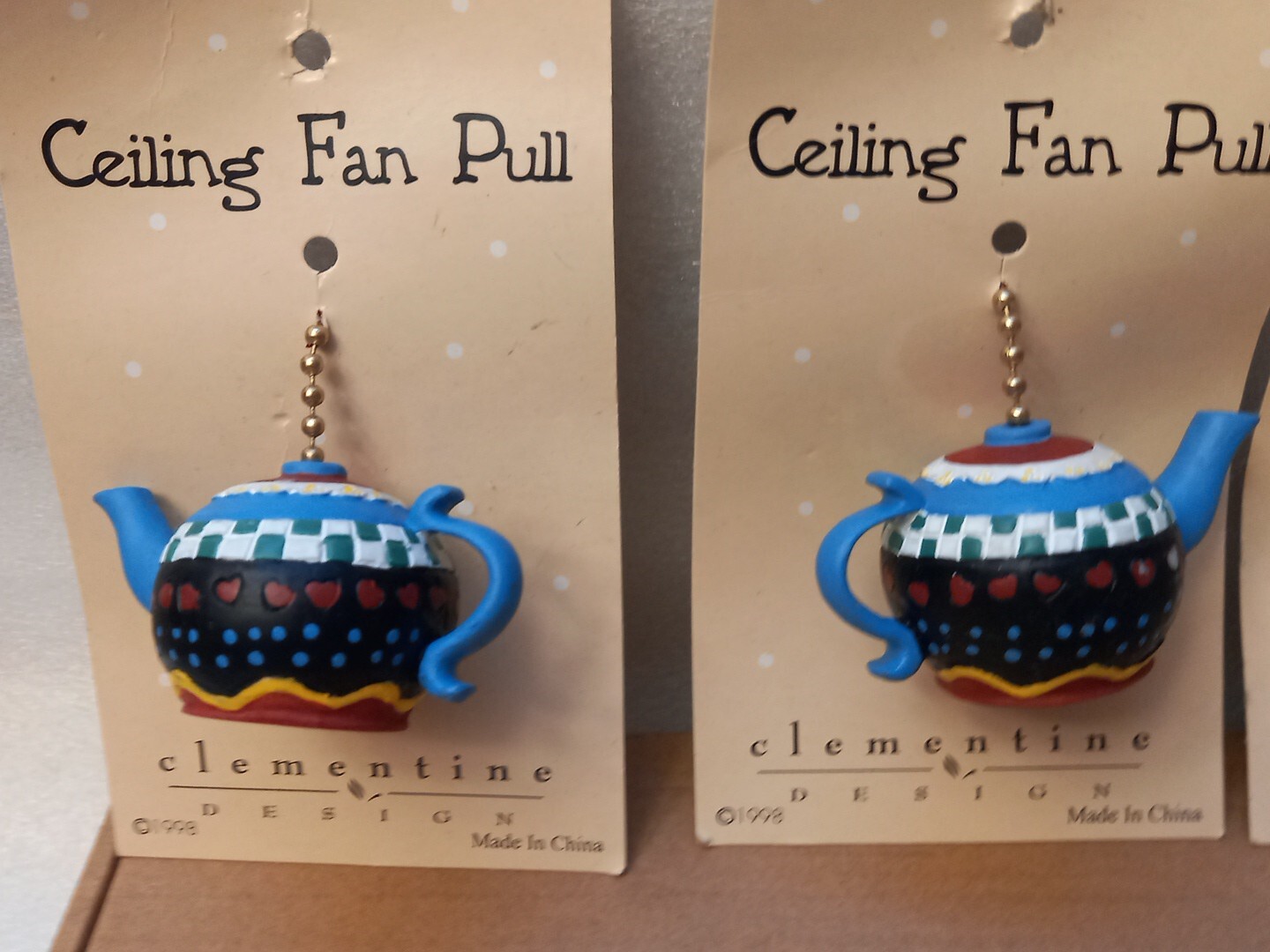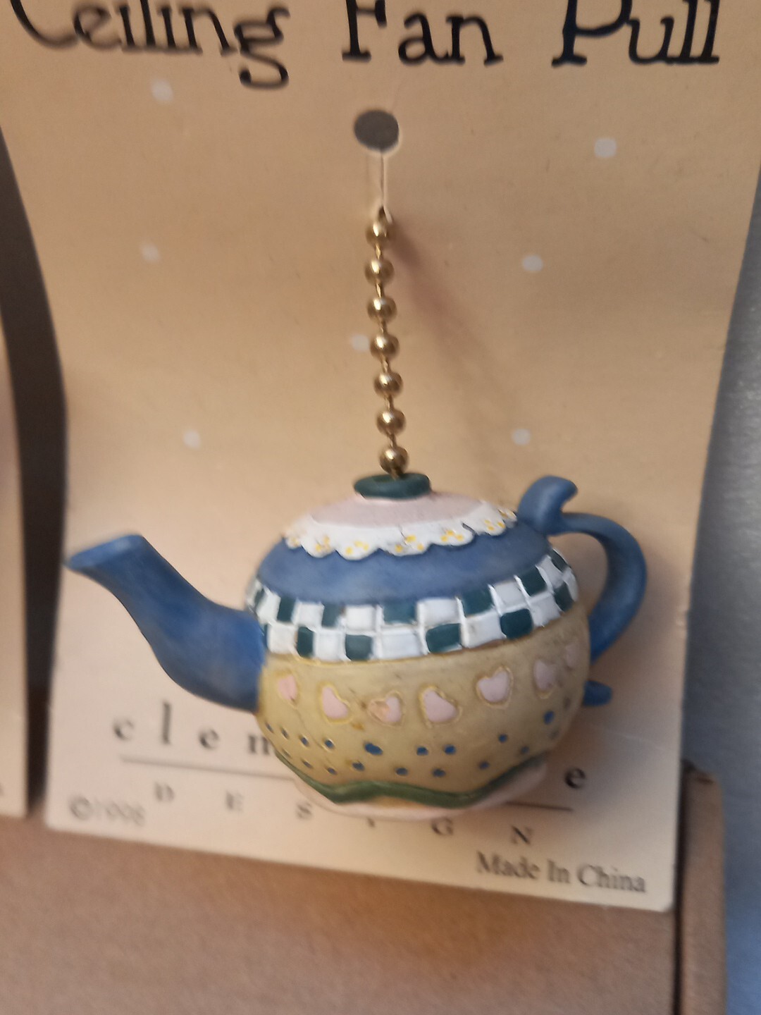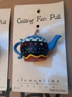 **NEW** Clementine design ceiling fan/light pulls with chain. Teapots (3) available. Listing is for one only. Various sizes approximately 2-3" inches. 1 shipping charge only when buying in multiple Please see pictures for more detail and description. Questions please ask. Teapot white#003- Teapot blue (2) available #015