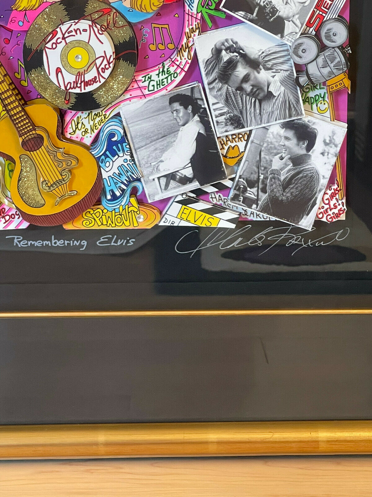 Remembering Elvis Premier Edition Number 33 of 100. Image Size 15X23, Framed 27X36. Tjis is a beautiful Authentic peice from Pop Artist Charles Fazzino. Signed bottom left hand corner. Beautifully Framed in Black and Rich Gold. This is a must for all Elvis Lovers