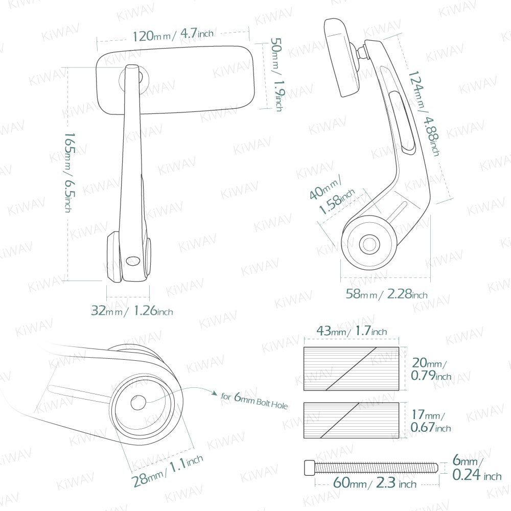 2020 new version mounting adapter! KiWAV provides a wide selection of stylish and sturdy motorcycle mirrors. It's the first thing you need to change to when you buy a motorcycle. Classic series is not the latest design but it's one of the most wanted one of all times. motorcycle bar end mirrors Classic chrome universal fit for 1" &1-1/4" hollow handlebar WARNING: Colors may vary depending on monitor profiles and printer settings. Video We have clear mini videos which shows more details and helps to visualize your modification before actually having it on hands. Your browser doesn't support HTML5 video. Download the video . Measurement Please must check the measurement before making final decision. Please allow measuring deviation due to manual measurement. Item size measurement graph Specification SKU: 100104718261004 Features The improved expansion components provides a better way to secure bar end mirrors inside the handlebar. It can be mounted in 2 way, standard upright or flip it down. Sturdy and durable with CNC 6061 aluminum mirror stem and mirror plate. Ideal for cafe racer and streetfighter. Material Mirror Housing: CNC aluminum Mirror Stem: CNC milled aluminum Shape Square Glass Blue tinted convex lens Weight n.w.: 813 g./ 1.79 lbs. (pair), g.w.: 1073 g./ 2.36 lbs. (total package, packing inclusive) Color Chrome Adjustment Two adjusting joint for 360 degrees Package A pair of mirrors (left hand/ right hand), 17, 20mm expansion components-hollow side x 2, 17, 20mm expansion components-threaded side x 2, M6 bolt x 2 Compatibility It ONLY works on outer diameter 1" and 1-1/4" hollow-ended handlebars with internal diameter (ID): The 17mm expansion components set is for ID of 17.5mm to 20.4mm , and the 20mm expansion components set is for ID of 20.5mm to 24.9mm . If the ID of your bar does not fall in the range above, please contact us before purchase. *For 7/8" hollow ended handlebars or threaded inside the bar end, please find the suitable set in our store, or leave the model and year of the motorcycle as notes before finishing your order. 1. Can not be installed on vehicles having electronic throttle control (ETC). 2. Some bikes with solid bar need to drill and tap. Modification might be needed. 3. For 7/8" hollow ended handlebars or threaded inside the bar end, please find the suitable set in our store, or leave the model and year of the motorcycle as notes before finishing your order. 4. Because of the small dimensions of the mirror glass, this product must only be fitted for racing or show purposes. 5. Might need to apply some washers as spacer to avoid contact with grips. (spacers are not included.) KiWAV, kiwavMirror, kiwavmotor, motorcycle, ClassicHB, ext1inch, Classic, barend, bar end, chromecolor How to buy with the right compatibility? We have different packages for different types and sizes of handlebars, coming with different mounting hardware pack. (bolt-on pack OR expansion bolts pack) Please refer to tips below and order the proper package for your motorcycle. A. Hollow bar ends Measure the inner diameter of the handlebar, if it's 14~20mm , search " KiWAV bar end 7/8" hollow " to see more. If it's 17~24mm , search " KiWAV bar end 1" & 1-1/4" hollow " to see more. If it's 14~24mm , search " KiWAV bar end 7/8" & 1" & 1-1/4" hollow " to see more. We also have fittings for specific model: Harley Davidson bikes with a hollow stock OE handlebar, → search " KiWAV bar end Harley Davidson hollow bars " to see more. Indian bikes with a hollow stock OE handlebar, → search " KiWAV bar end Indian hollow bars " to see more. Honda Mini bikes models with stock OE handlebar, → search " KiWAV bar end Honda Monkey " to see more. B. Threaded bar ends Measure your removed handlebar end weight's bolt for the bolt's pitch and size, and choose the compatibility according to it. Here is a list of the products we carry: " 8mm bolt with 1.25mm pitch " (M8 x 1.25P) on both side of bar end, fit for some models of these brands: BMW, Honda, Husqvarna, Indian, etc. → search " KiWAV bar end 8mm " to see more. " 6mm bolt with 1mm pitch " (M6 x 1.0P) on both side of bar end, fit for some models of these brands: Aprilia, BMW, Honda, KTM, Suzuki, Vespa, Yamaha, etc. → search " KiWAV bar end 6mm " to see more. We also have fittings for specific model: Indian Scout Bobber with a stock OE handlebar → search " KiWAV bar end Indian Scout Bobber " to see more. Indian with a stock OE handlebar → search " KiWAV bar end Indian " to see more. BMW bikes with a M8 threaded stock OE handlebar → search " KiWAV bar end M8 for BMW " to see more. BMW bikes with a M10 threaded stock OE handlebar → search " KiWAV bar end M10 for BMW " to see more. BMW bikes with a M12 threaded stock OE handlebar → search " KiWAV bar end M12 for BMW " to see more. Yamaha bikes with a M16 threaded stock OE handlebar → search " KiWAV bar end Yamaha " to see more. Triumph air-cooled model with a M5/M6 threaded stock OE handlebar → search " KiWAV bar end Triumph air " to see more. Triumph water-cooled model with a M6 threaded stock OE handlebar → search " KiWAV bar end Triumph water " to see more. Some Moto Guzzi / Aprilia / Honda models with a M6 threaded stock OE handlebar (*original bar end thread adapters are required) → search " KiWAV bar end Moto Guzzi " to see more. Harley Davidson bikes with a M8 threaded stock OE handlebar (*original bar end caps part #55801252 are required) → search " KiWAV bar end Sportster Nightster " to see more. C. Solid bar ends You'll have to customize it to A(hollow bar ends) or C(threaded bar ends). D. Protruding bar ends Measure the outer diameter of the handlebar, if it's a 7/8" or 1" handlebar , → search " KiWAV bar end clamp-on " to see more. We Recommend About "We just love good products. If only those are fair priced, the world would just be a perfect place. That's what we're here for." KiWAV is built as a team of professionals, with expertise in different fields. We love