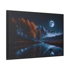Moody Moonlit Mountain Lake Landscape Illustration Product Description : Immerse yourself in the dramatic beauty of nature with this Moonlit Mountain Lake Landscape Illustration by Hypnotik Creations. This breathtaking piece captures the moody allure of a serene full moon illuminating a tranquil lake with a perfectly still and reflective surface. Framed by rugged rocky mountain peaks in the distance, the landscape transitions into lush pine forests cascading down the slopes on one side and vibrant orange autumn foliage gracing the opposite edge of the lake. With its rich, dark color palette dominated by deep blues and fiery oranges, this photography-inspired illustration brings the raw beauty of the wilderness to life. Expertly printed in HDR on museum-quality cotton-polyester composite gallery-wrapped canvas, this artwork features a proprietary matte finish coating that enhances vibrancy and ensures long-lasting, eye-catching detail. Using UL-certified Greenguard Gold latex inks that are non-hazardous, non-toxic, and non-flammable, the artwork guarantees unmatched quality while being safe for any environment. Encased in a 1.25" solid pine wood frame with a sleek black finish, the canvas creates a stunning floating effect that elevates its aesthetic appeal. Made from sustainably sourced Forest Stewardship Council-certified materials, the frame is an eco-friendly choice that aligns with modern sustainability values. The piece arrives ready to hang, complete with sawtooth hanging hardware pre-attached and rubber dots on the bottom to keep it securely in place. Key Features : Breathtaking Design : Features a tranquil full moonlit lake surrounded by rocky peaks, lush pine forests, and vibrant autumn foliage. Photography-Inspired Art : Dark, rich color palette dominated by deep blues and warm oranges for a striking visual impact. Museum-Quality Canvas : Printed in HDR on a premium cotton-polyester composite gallery-wrapped canvas with a proprietary matte finish coating for long-lasting vibrancy. Eco-Friendly Materials : Crafted with UL-certified Greenguard Gold latex inks and sustainably sourced Forest Stewardship Council-certified pine wood. Elegant Framing : 1.25" solid black pine wood frame provides a modern floating effect to enhance any interior space. Ready to Hang : Comes with pre-attached sawtooth hanging hardware and rubber dots for stability. Durable and Safe : Uses non-hazardous, non-toxic, and non-flammable inks; canvas can be gently wiped with a clean, damp cloth to maintain its beauty. Slight Size Variations : Due to the production process, allow for size deviations within +/- 1/8" (3.2mm). Transform your space with this striking depiction of nature’s untamed beauty. Ideal for nature enthusiasts and art lovers, this captivating piece creates a tranquil yet dramatic focal point in any setting. * Shipping to Alaska, Hawaii, and unincorporated territories of the United States can take additional 7 ? 12 business days, weather permitting.