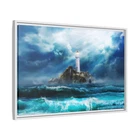 Cinematic Coastal Lighthouse Illustration by Hypnotik Creations Product Description: Immerse yourself in the serene beauty of the coast with this cinematic coastal illustration by Hypnotik Creations. This enchanting artwork features a picturesque white lighthouse perched atop a rocky island, complemented by a cascading waterfall and a mesmerizing blue surf seascape. Sunbeams pierce through dramatic clouds, casting a radiant glow across the scene, evoking a sense of nautical charm and tranquility. Expertly printed on museum-quality cotton-polyester composite gallery-wrapped canvas , this artwork boasts vibrant colors and remarkable detail, protected by a special proprietary matte finish coating for lasting brilliance. The high-definition imagery is produced using UL-certified Greenguard Gold inks and latex inks that are non-hazardous, non-toxic, and non-flammable. Encased in a 1.25" solid pine wood frame , available in white or black, the frame enhances the artwork with a modern floating effect. Sustainably sourced and Forest Stewardship Council certified , the frame is an eco-friendly choice, perfect for any interior space. The canvas comes ready to hang straight out of the box , equipped with sawtooth hanging hardware for hassle-free installation. Please note: slight size deviations may occur due to the production process (+/- 1/8", or 3.2mm). To maintain its pristine condition, simply wipe the surface gently with a clean, damp cloth if it gathers dust. Key Features: Cinematic Illustration: Features a lighthouse on a rock island, a small waterfall, blue surf, and sunbeams breaking through clouds. Premium Printing: Expertly printed on museum-quality cotton-polyester composite canvas with vibrant, long-lasting colors. Eco-Friendly Materials: Made with sustainably sourced Forest Stewardship Council-certified pine wood . High-Quality Inks: Utilizes UL-certified Greenguard Gold inks and latex inks that are safe, non-toxic, and non-flammable. Modern Framing: 1.25" solid pine wood frame in black or white with a floating effect. Ready to Hang: Equipped with sawtooth hardware for easy installation. Durable and Low Maintenance: Matte finish coating protects against dust and fading; clean gently with a damp cloth as needed. Size Tolerance: Minor size deviations (+/- 1/8", or 3.2mm) due to the production process. Frame Color Options: Black & White. Size Options: 30x20, 36x24 & 48x32 Enhance your home or office with this nautical masterpiece , blending natural beauty with timeless coastal charm. * Shipping to Alaska, Hawaii, and unincorporated territories of the United States can take additional 7 ? 12 business days, weather permitting.
