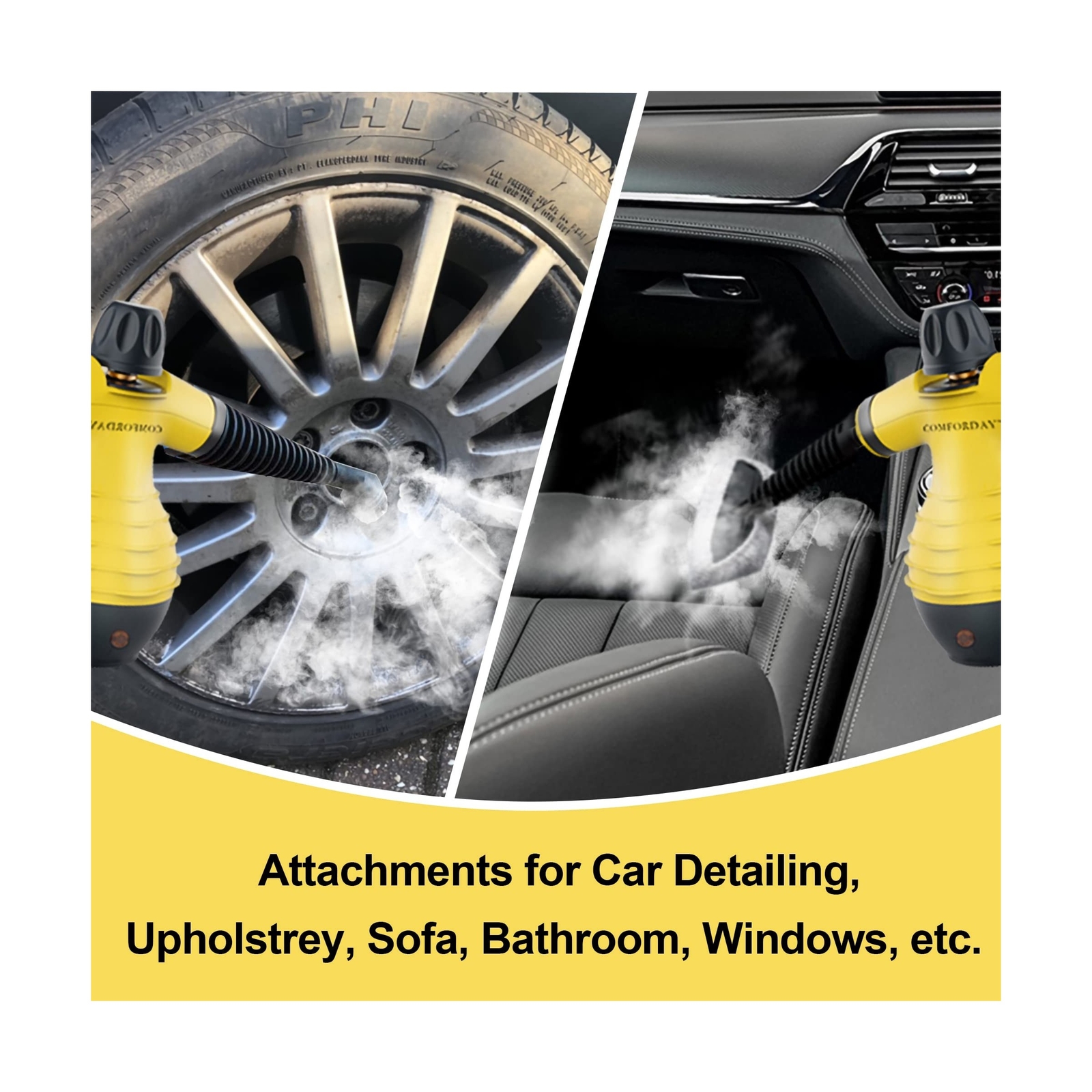 Comforday Multi-Purpose Handheld Pressurized Steam Cleaner with 9-Piece Accessories, Perfect for Stain Removal, Curtains, Car Seats, Floor, Carpet, Window Cleaning - Buy Now with Fast Shipping! Comforday Multi-Purpose Handheld Pressurized Steam Cleaner with 9-Piece Accessories, Perfect for Stain Removal, Curtains, Car Seats, Floor, Carpet, Window Cleaning Product Details Brand: Comforday Special Feature: Multi-Surface Cleaning, Chemical-Free, Lightweight and Portable Surface Recommendation: Floor,Window Cable Length: 9.8 Feet Model Name: Perfect for Stain Removal, Curtains, Brand: Comforday Special Feature: Multi-Surface Cleaning, Chemical-Free, Lightweight and Portable Surface Recommendation: Floor,Window Cable Length: 9.8 Feet Model Name: Perfect for Stain Removal, Curtains, Included Components: Nozzle Wattage: 1050 watts Item Weight: 1.5 Kilograms Tank Volume: 350 Milliliters Form Factor: Handheld Color: yellow Power Source: Ac/dc Voltage: 2.5E+4 Volts Capacity: 2.5E+2 Milliliters Style: Handheld Product Dimensions: 8.97"D x 5.46"W x 10.92"H UPC: 688098121830 878312005101 Manufacture Year: 2022 Global Trade Identification Number: 30 Item Weight: 3.3 pounds Manufacturer: comforday Item model number: Comforday Multi-Purpose Handheld Is Discontinued By Manufacturer: No Date First Available: October 9, 2016 Key Features ✅ Free 9 Accessories Included: Comes with a complete 9-piece kit, including an extended nozzle, spray cup with brush, bent spray, funnel, measuring cup, spray cup for doors and windows, towel sleeve, brush plate, and long spray cup for versatile cleaning tasks. ✅ Multi-Surface Versatility: Cleans sealed surfaces like ceramic, vinyl, laminate, granite, marble, and hardwood floors. Perfect for sinks, stoves, countertops, floors, windows, bathrooms, pet areas, car interiors, grills, and more. ✅ Powerful Hot Steam: Powered by 1050W, this steam cleaner heats water to 221F (105C) in just 34 minutes and provides up to 20 minutes of continuous steam. Equipped with a 350ml tank, it is recommended to fill up to 250ml to prevent overflow during boiling. The 9.8-foot (3m) cord makes it ideal for indoor and outdoor use, cutting through grease, grout, and stubborn stains with ease. ✅ Chemical-Free and Safe: Provides 100% chemical-free cleaning with no harmful fumes or residue. Equipped with a safety lock and safety cap for safe operation, its an eco-friendly solution for your family. ✅ Satisfaction Guaranteed: We stand by our product with a commitment to your satisfaction. If you need assistance or are not completely satisfied, our dedicated customer care team is here to help. Product Description