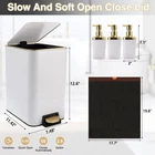 [Save-Space Small Trash Can]: XLHOMO slim bathroom trash can with a lid making it a fit for the bathroom, bedroom, office, or any narrow space. Are you still annoyed by the narrow space in the room being wasted? Use it to improve your space utilization [Soft Close & Stay Open Lid]: The lid opens and closes smoothly and silently with a push of the pedal as quietly as flipping a book, don’t worry about disturbing the rest of your family. Fix the lid at 90° to stay open as long as you need [Odor Control & Pet] : The lid fits closely to the mouth of the small trash can. The design of the lid also can effectively Block your pet from going in it and messing up your room. [Sturdy Steel Pedal]: Upgrade foot pedal of the bathroom trash can combines stainless steel tread with plastic material, making a lighter and more comfortable pedaling experience.Engineered to last over 150,000 steps, allowing you to step more than 20 steps a day for 20 years [Removable Inner Bucket]: The step trash can has a durable plastic liner bucket that can be easily lifted out for easy dumping of trash and rinsing quickly when needed;There is a carry handle on the back of the slim trash can to move it easier [Package Included]:white and gold trash can,3PCS Soap Dispenser,100 Count 5 Gallon Trash Bag,6 Waterproof Tags. each accessory is carefully selected to meet your daily needs.Our black and gold bathroom set is not only practical but also beautiful, making your bathroom space more neat and comfortable [High-Quality Material]: This garbage can is made of Stainless Steel, thick and durable, and anti-fingerprint; The inner barrel is made of pp material, and the inner barrel is equipped with a garbage bag fixing ring to prevent the garbage bag from falling