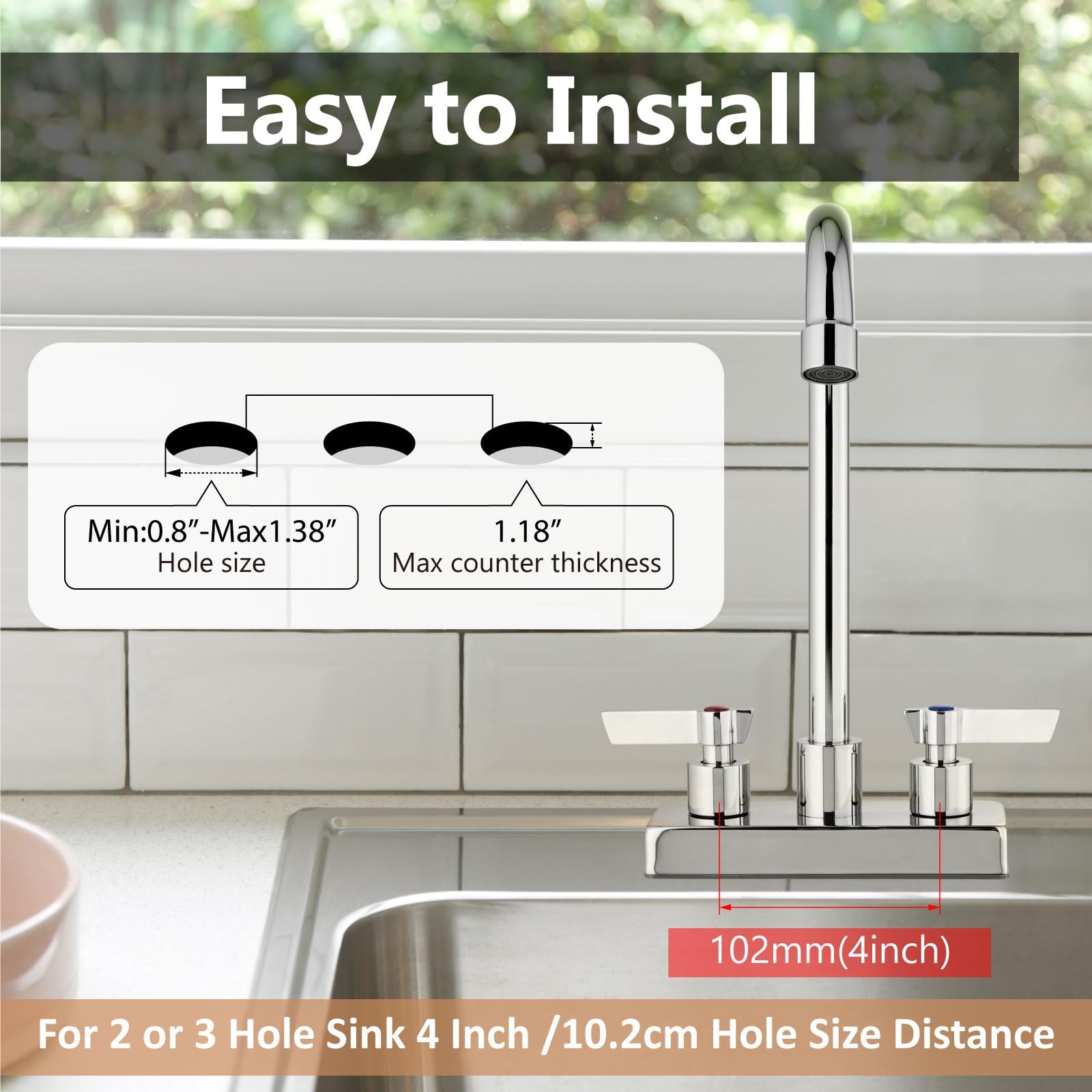 Multipurpose-Water Use Information: 1.2gpm 4.54L/min.Great choice for commercial and home use, perfect for bar sinks, laundry tubs, kitchen islands, prep sinks, bathrooms, RV sinks. Comes with removable aerator. Material- This bar sink faucet spout is made of SUS304 material, which is not easy to rust and practical. The overall appearance is modern and stylish. Temperature Control-Commercial faucets for sink 2or3 hole with two lever handles for easily and smoothly adjustments of water flow and temperature. Easy to install - 4" centerset, 2 holes deck mount,rotatable spout.Comes with instructions for easy installation. Easy to clean- The rotatable spout can easily clean every corner.