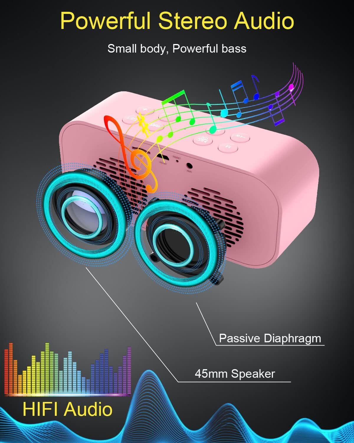 【Multifunctional and Practical Design】-Bluetooth speaker + digital alarm clock + hands-free calling + mirror LED display.This table clock Bluetooth speaker is suitable for listening to audiobooks or party at night,watching movies,office video conferencing,cell phone calls.This digital clock for bedrooms is designed for modern life. 【Wake Up Happy】-The dual alarm function of the bedside clock allows you to set up two different wake-up times to ensure you are never late for work. Each alarm clock with snooze function allows you to sleep for 5 minutes more,up to 3 snooze times,Or you can press any key 2 times to stop that is really convenient.This alarm clock for heavy sleepers adults/teens with 3 level dimmer,you can adjust the display brightness according to your needs and avoid glare at night. 【Bluetooth Speaker with Excellent Sound Quality】-Powerful speaker with surround stereo subwoofer,you will enjoy high quality stereo music whether it is Bluetooth connection,TF playback or AUX connection.Bluetooth speaker built-in microphone,intelligent noise reduction without delay,so you can free your hands when talking. 【Easy Connection with Different Devices】:The bedroom clock speaker can connect to any Bluetooth device you own. Easily connect to smartphones, tablets, laptops and computers via wireless Bluetooth. An AUX audio cable is also included in the package, so you can connect any non-Bluetooth devices that support audio connection. In addition, you can also play music with TF card (Note: TF card is not included in the package). 【Long Playback】-The LED clock speaker has a built-in 2000mAh high-capacity rechargeable battery, with a playback time of about 8-10 hours at medium volume,and the battery of this small alarm clock can be fully charged easily via the USB charging cable included in the package.