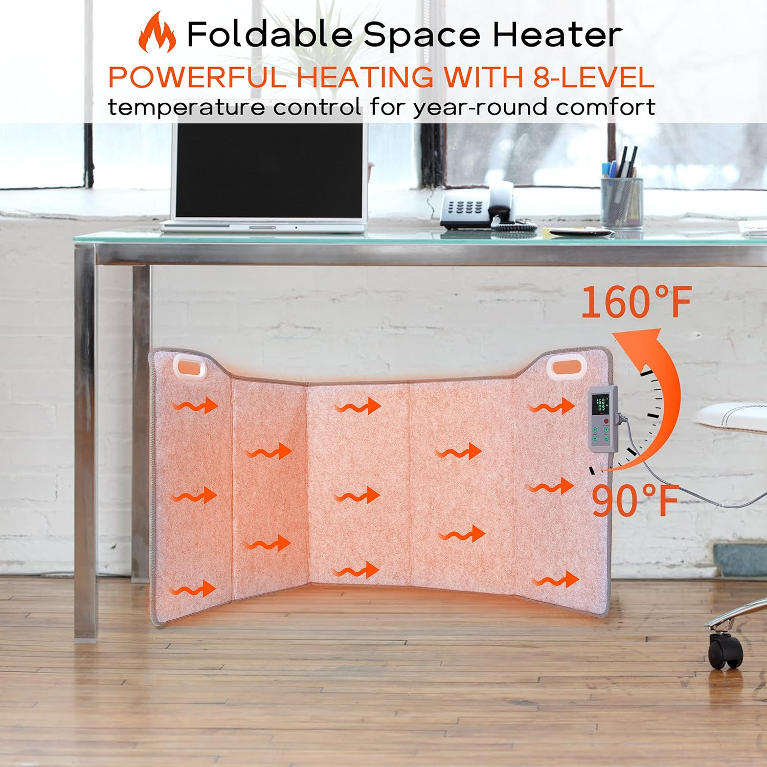 Personal Space Heater: The foldable stand up warming mat is small and compact, and silent, so it is easy to use anywhere! It’s flat, slim, and lightweight with a handle so you can use it at work, in your dorm or studio, your house, or even a tent. Electric Foot Warmer: Our foot warmer (under desk) is child and pet friendly and electric, using flameless, radiant heating. It’s great for indoor use, and will keep you always wrapped and cozy in a warm climate , with 8 levels of heat up to 160°F. Heater With Timer and Auto Shut Off: The foldable, heated standing foot warmer comes with an easy-to-use controller with a thermostat to control the temperature at 8 levels. Stay warm inside your home with the programmable, electrical heater. Safe Energy Efficient Heater: The thermostatically controlled heater is fanless, and is low power. It has an automatic shutoff after up to 9 hours and has a tip over auto turn off. It’s safe to use around children and animals, or in a nursery. Universal Use: The heater is great to use in winter for livestock and pets. Use it in the barn to keep your chickens, rabbit, and other animals warm, or inside for your dog, cat, or birds. The high efficiency products won’t overheat or harm pets. Product Description Innovative Foldable Space Heater & Leg Warmer 180°surround heating design Wrap the heater around your legs for optimum heating with the 180° surround design. Be completely englufed in comforting warmth on chilly days and cold nights. Muiltiple safety features to protect you & your family. Safety is our priority, which is why our heater features an automatic shutoff when tipped over. And don't worry if you forgot to turn it off: the device will automatically shut down once the timer ends. Namaste Perfect for any place you go--even the office or a library--this heater is completely silent. Feel free to run it at night even when your family is asleep. You can relax in the peaceful silence of this heater. 8 Heat Levels Unique Features Advanced civil heating technology Made from advance technology, this heater is the perfect addition to heat up any environment. It runs silently and efficiently, and comes with a timer and different heat levels so you can control your environment. Extra long cord With an extra long cord at 78 inches, you can easily use it anywhere and be sure it will reach. You won't need to create more clutter with another extension cord. Durable premium fireproof material The material is soft but durable, and fireproof as safety is our priority. You can relax in the warmth and rest in ease knowing that this heater won't burn or damage easily.