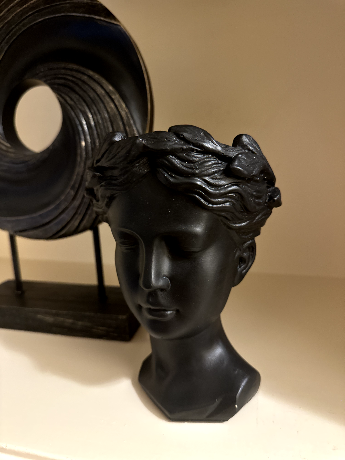 Roman Goddess Venus Planter This concrete Venus statue planter is uniquely designed as a Greco-Roman era statue. The bust head is finished with black paint to enhance the antique look. Makes a great piece to display small plants, herbs, and succulents. This item is handmade and was purchased off Etsy for $70. Overall: 6" W x 5.25" D x 7.25" H Planting Area: 3.75" W x 4" D x 2.75" H Decorative Medallion on Stand - Black & Gold Features a captivating pattern, bringing a modern and artistic element to any room. Whether displayed on a shelf, mantel, or entryway table, this decorative plate is sure to complement a variety of decor styles. Overall: 7.75" W x 3" D x 13.75" H