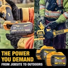 Cordless Battery Powered Handheld Leaf Blower Kit & Cordless Chainsaw Tool Only Tools include battery powered Leaf Blower & Chainsaw Kit does not include battery or charger Compatible across DEWALT 60V MAX FLEXVOLT Battery System Get the job done with this DeWalt 60V Max Flexvolt Cordless Axial Blower. Perfect for construction and outdoor cutting applications, it delivers up to 600 CFM of air volume at 125 MPH. A variable speed trigger and speed lock controls output. To offer maximum power and extend runtime, it includes a high-efficiency brushless motor. The low-kickback Oregon bar oils automatically for control. With the 20V/60V Max Flexvolt battery, you can charge all your 20V/60V Max tools and equipment and 20V Max chargers. Up to 600 CFM of air volume at 125 MPH to power through debris Variable speed trigger and speed lock maintain control High-efficiency brushless motor helps extend runtime One 3 Ah battery and charger included Includes 60V MAX 3 Ah battery and charger DCCS670B low kick back 16-in. Oregon bar and chain for construction and outdoor cutting applications DCCS670B Auto-oiling for continuous lubrication DCCS670B quarter-turn oil cap for quick oil refills DCCS670B up to 70 cuts per charge on a 6 in. x 6 in. pressure treated pine wood DCCS670B chain brake for kick back protection DCCS670B tool-free chain tensioning and bar tightening knob for proper bar clamping force DCCS670B includes hard bar cover DCCS670B ideal for construction and outdoor cutting applications Battery Amp Hours 3 Ah Battery Voltage (V) 60V Included Battery,Charger Included Accessories Battery,Charger Maximum Air Volume (CFM) 600 Maximum air speed (mph) 125 Noise rating (dB) 67 Number of Total Batteries Included 1 Power Type Cordless Electric Refurbished No Returnable 90-Day Start Type Electric Tools Included Blower,Chainsaw Watt Hours 180 Manufacturer Warranty 3 Year Limited Warranty (n/a)