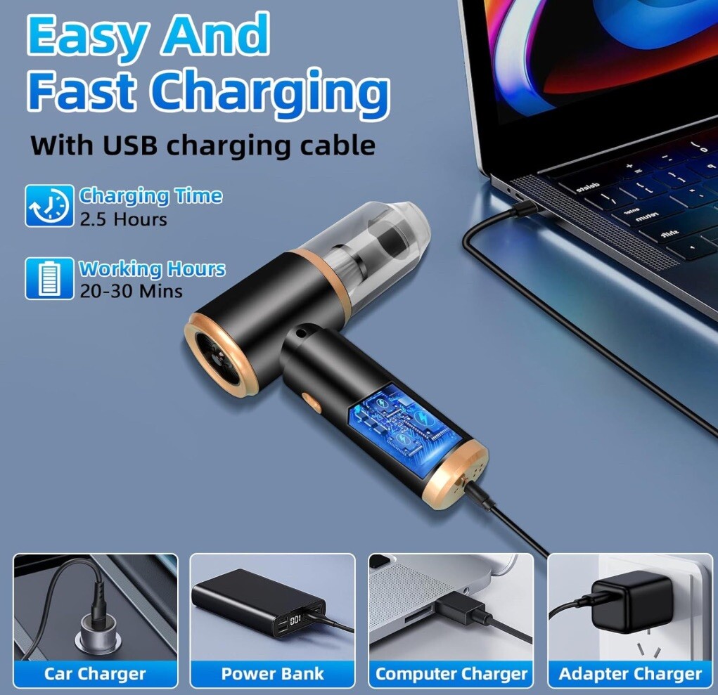 This handheld vacuum is a game-changer for quick cleanups! The 9000Pa suction power easily picks up crumbs, dust, and pet hair from cars, sofas, and tight spaces. Love that it's cordless and lightweight—no more struggling with bulky vacuums. The battery lasts long enough for a full car clean, and the HEPA filter keeps dust trapped. Super convenient with multiple nozzles for different surfaces. Works great in the office too—super quiet and efficient! Highly recommend for hassle-free cleaning on the go.
