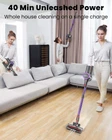 【Unmatched Deep Cleaning in One Stroke】:Experience the extraordinary strength of the vacuum cleaner. Upgraded 200W high-power motor unleashes an astonishing suction power of up to 25000Pa, easily penetrating furniture gaps and deep carpet fibers to capture stubborn dust and microscopic particles in one fell swoop, bringing a refreshing transformation to your home environment. 【Unparalleled Freedom with Extended Battery Life】:Feel the unparalleled freedom of the cordless vacuum cleaner. With its exceptional battery performance, it effortlessly tackles spaces up to 2200 square feet in a single charge. Boasting a runtime of 40 minutes and interchangeable accessories, it allows you to clean every corner of your home as you wish, effortlessly enjoying the joy of cleaning. 【6-Stage Filtration for Pure Health】:Savor the health benefits of the wireless vacuum cleaner. The 6-stage Filtration system captures 99.9% of dust and fine debris. Whether on hardwood floors, carpets, or furniture surfaces. Provides you and your family with a fresh, healthy living environment.Let every breath be a delight. 【Effortless Dust Management with Super Dustbin】: Discover the convenience and efficiency of the stick vacuum cleaner. 1.5L dustbin significantly reduces the hassle of frequent emptying.One Click Empty Design makes the dust disposal process exceptionally simple; with just a gentle press, the dust and debris inside the dustbin can be quickly cleared, making your cleaning tasks easier and more efficient. 【Innovative Anti-Tangle & LED-Lit Floor Brush】:Appreciate the thoughtful design of the vacuum cordless rechargeable. Innovative anti-tangle roller brush effectively prevents hair and debris entanglement, smoothing the cleaning process.Addition of the LED floor brush like a searchlight, illuminating blind spots and ensuring every inch of space is as clean as new!