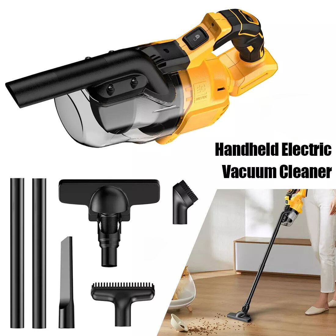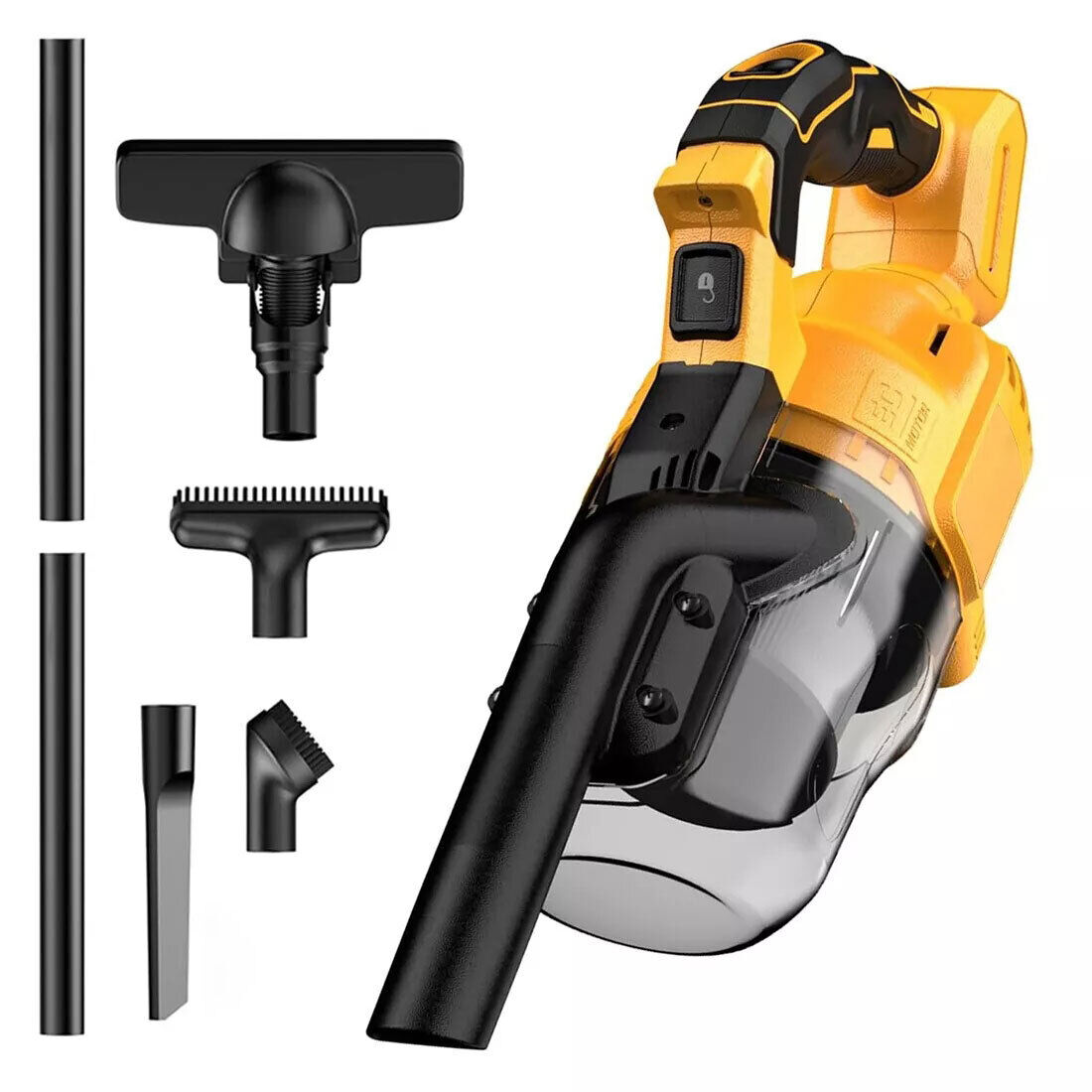 【German-Inspired Design】 Featuring a design inspired by German engineering, this vacuum cleaner is not only visually appealing but also strives for perfection in user experience. Its streamlined design makes it easy to operate while providing an excellent grip, allowing effortless cleaning. 【Compatible with DeWalt DCB Series Batteries】 Compatible with DeWalt DCB series batteries, you no longer have to worry about power issues. The robust battery supports extended use, making it suitable for various cleaning scenarios, ensuring you won't have interruptions while cleaning. 【For Multi-Scenario Use 】 Comes with multiple types of vacuum hoses, adaptable to different cleaning needs. Whether cleaning floors, furniture, or hard-to-reach corners, users can easily switch between hoses to tackle any cleaning challenge. Applicable Scenarios: Home cleaning Interior car cleaning Office and workspace cleaning Product Features: Lightweight design for easy portability and storage. Powerful suction for thorough cleaning. Simple operating interface, suitable for all users. 4 Accessory cleaning solutions. Easy empty canister to minimize exposure to dust and debris. concrete and drywall. A bright LED light illuminates the darkest areas. SpecificationsSpecificationsType : HandheldRated input power:500 WVacuum degree :16000paColour:YellowCompatible Battery :For Dewalt 20V BatteryBattery Included : NOAir Flow (CFM):46CFMRPM:30000R/MIN What's In Box 1 x Vacuum cleaner (Without battery) 1 x crevice nozzle 2 x brush 2 × Suction long pole 1 × instruction manual