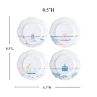 This charming set of 4 scalloped melamine dessert/salad plates features: the pier, a beach umbrella, a sailboat and a lifeguard stand - each beautifully depicted in a calming palette of pastel hues on a durable melamine base. USE AND CARE: Dishwasher safe, top shelf recommended; not oven, microwave or freezer safe. Not suitable for hot contents. Melamine salad plates are BPA free and break-resistant. OUTDOOR DINING: White melamine plates are ideal accompaniment for engagement parties, promotion parties, gatherings with friends, picnics or classy cocktails. Also great for people with ; you won’t have to worry about shattering glass. SOPHISTICATED DESIGN: Embossed pattern around the plate. Made in the China and measures 8.25"W x 0.5"H x 8.25"L. GLASS APPEARANCE: Provides glass like appearance and greater durability. Don’t worry about someone dropping glass and shattering it everywhere. Enjoy the stylish appearance of glass as well as the durability w COMPANY AND QUALITY: As newlyweds and unabashed romantics, Capucine and David Gooding founded in 2001 with a small collection of mouth-blown glassware. Today, produces hundreds of options for your table and home, including an array of charming holiday collections. Discover inspired ways to express the of the season through .