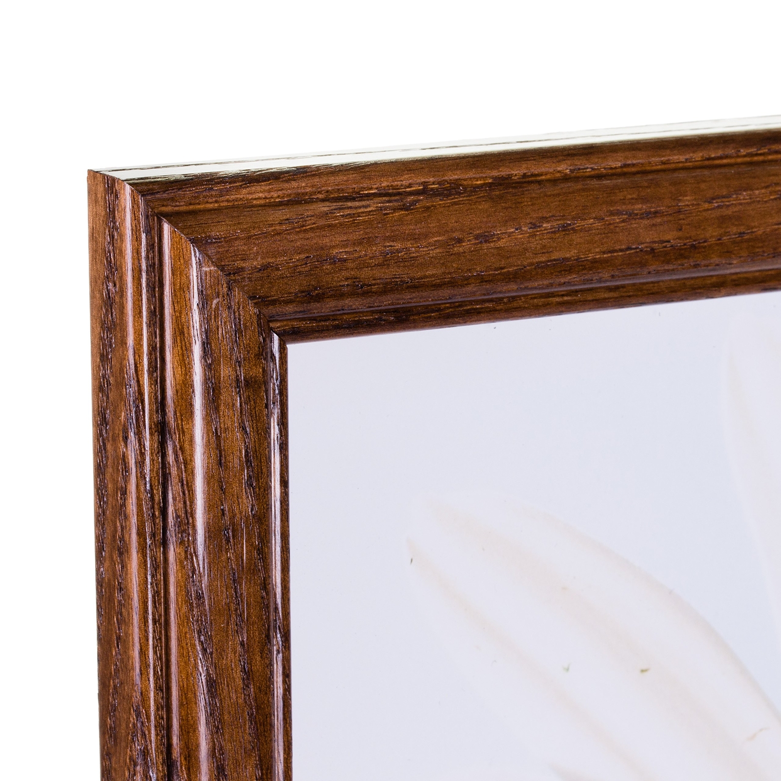 Traditional style; semi-gloss walnut brown stain finish; visible wood grain **COLOR AND GRAIN PATTERN MAY VARY SLIGHTLY WITH EACH FRAME** Frame includes: white matting, glass, rigid black backing and pre-attached stamped hanging hardware Matted frame is designed to display a 8 x 10 inch photo/print/poster (matting will overlap image by .25" on each side). Frame will display a 11 x 14 inch photo/print/poster without the matting (frame lip will overlap image by .25" on each side). Frame moulding is 0.75 inches wide; solid Ash wood construction Frame is designed for WALL HANGING only (hanging hardware allows for portrait or landscape orientation)