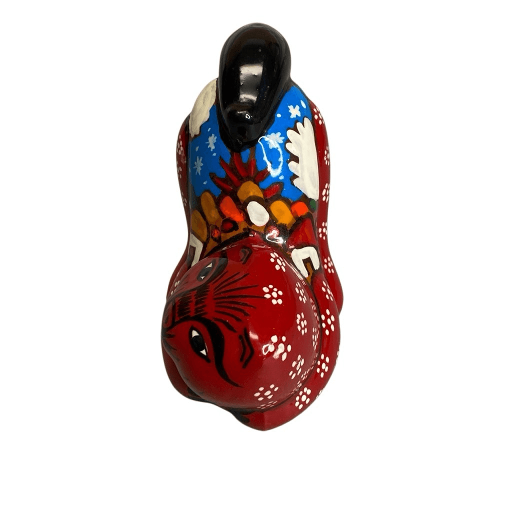 Crouching Mexican Folk Art Red Clay Tonala Cat Whimsical Hand Painted This beautiful handcrafted cat figurine is a stunning example of Mexican folk art. Made from red clay using traditional techniques, it features intricate details that showcase the rich culture of Tonala. No chips or cracks noted. Measures approximately 3.5” tall x 2.25” wide x 4” long.