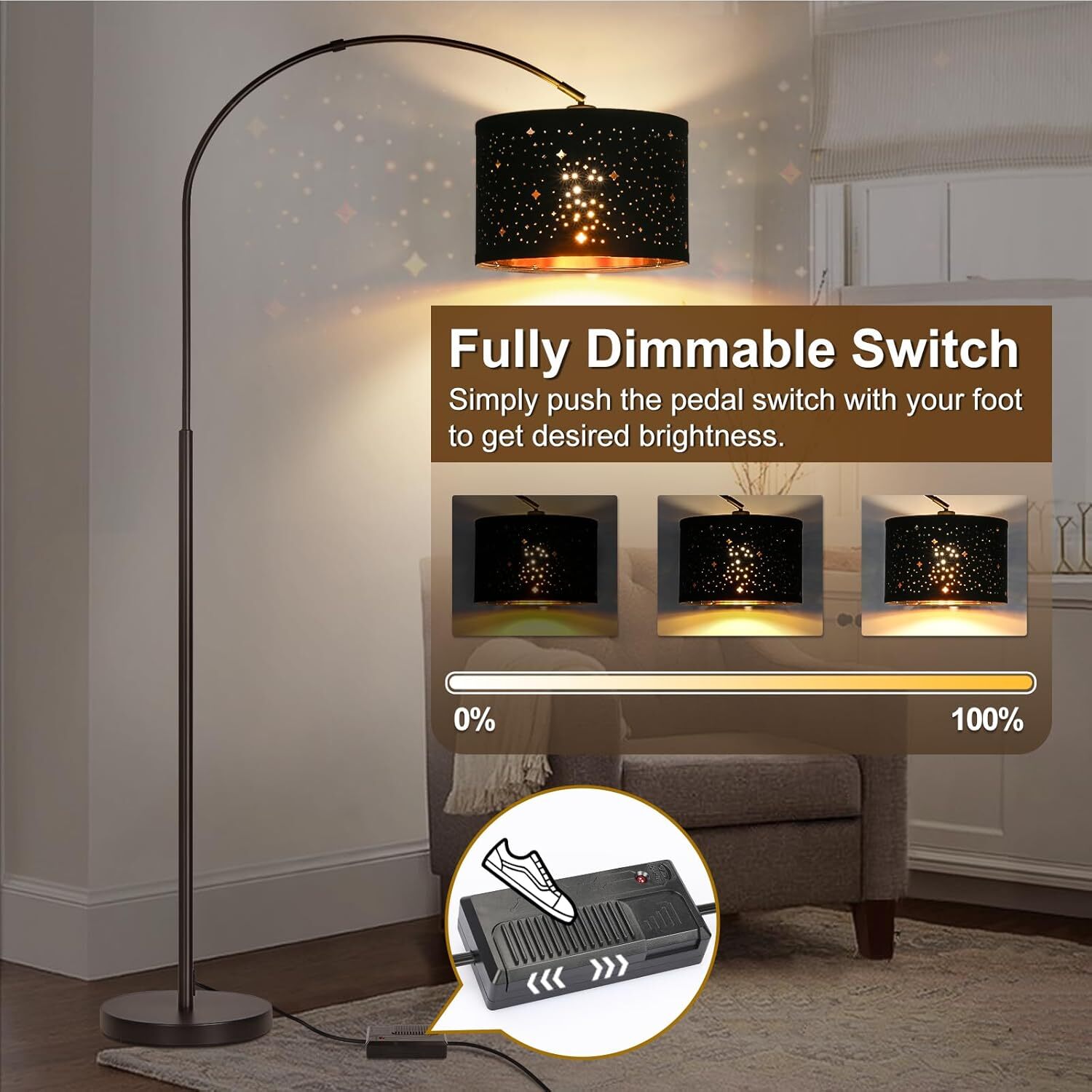About this item Useful Foot Dimmer: This floor lamps is controlled by a foot dimmer switch on the power cord, offering 0-100% brightness to meet your daily lighting needs. No need to bend down or tiptoe to reach, a easy push with feet will enable you to cutomize the brightness from dim to bright, great companion for reading, working, leisure and resting. Stylish& Romantic Look: Suspended stars drum shade from arched top, our lamp brings out simple yet elegant aesthetic. Integrating industrial touch with contemporary charm, the floor lamp for living room could seamlessly fit into any decor styles. Perfect light to hang over your sofa, desk or couch of living room, bedroom, office, den, favorite reading nook, etc. 9W LED Bulb Included: After several rounds of selection and comparison, we picked a 9W 3000K led bulb for the black floor lamp, no flickering, no buzzing and less heat output. Complemented with beige lamp shade, it will soften the light radiation and distribute the light evenly. Just enjoy harmony and cozy atmosphere when spending time with family or friends. Flexible Lamp Head: The modern floor lamp features a rotatable lamp head (350°horizontally and 180°vertically), which means you can direct the light angle precisely for various tasks. Note: To avoid damage, please hold the toppest join end of lamp pole simultaneously when rotate the lamp head. Weighted Base in High Quality: To keep balance well with long arm body, the lamp base is made from weighted material, prevents tipping or falling accidentally. Built with premium metal and exquisite workmanship, standing lamp will not get rusty or color fading after years of use, readily withstand the test of time.