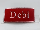 THIS AUCTION IS FOR A NEW EMBROIDERED IRON/SEW ON NAME PATCHES) ( SIZE 1-1/2 INCHES TALL AND 3-1/2 INCHES WIDE) DEBI (BORDER AND NAME EMBROIDERED ) (AVAILABLE IN WHITE ON RED) (NEW) SHIPPING FOR THIS ITEM WILL BE (FREEEE IN THE U.S.A.) PLEASE PAY THROUGH EBAY. ITEMS WILL BE SHIPPED 1 BUSINESS DAY AFTER RECEIVING PAYMENT. THANK YOU FOR LOOKING! ! CLICK HERE TO Save as Favorite Seller Most items will be shipping in a regular letter envelope and will NOT have a tracking number. All items will be shipped the next day, if you pay before 10:00am pacific time your package will ship same day. If you pay on Saturday you package will ship on Monday unless it is a holiday it will ship on Tuesday. I ship 6 days a week. by 10:00am pacific time. INTERNATIONAL BIDDERS SHIPPING FOR THIS ITEM WILL BE $3.00 FOR THE FIRST PATCH OR SET AND .25 FOR EACH ADDITIONAL PATCH. THANK YOU FOR WATCHING <div style="text-align:center"><a style="text-decoration:none" href="http://mostpopular.sellathon.com/?id=AC583636"><img src="http://www.sellathon.com/Resources/Images/countercredit.gif" border="0"></a></div>