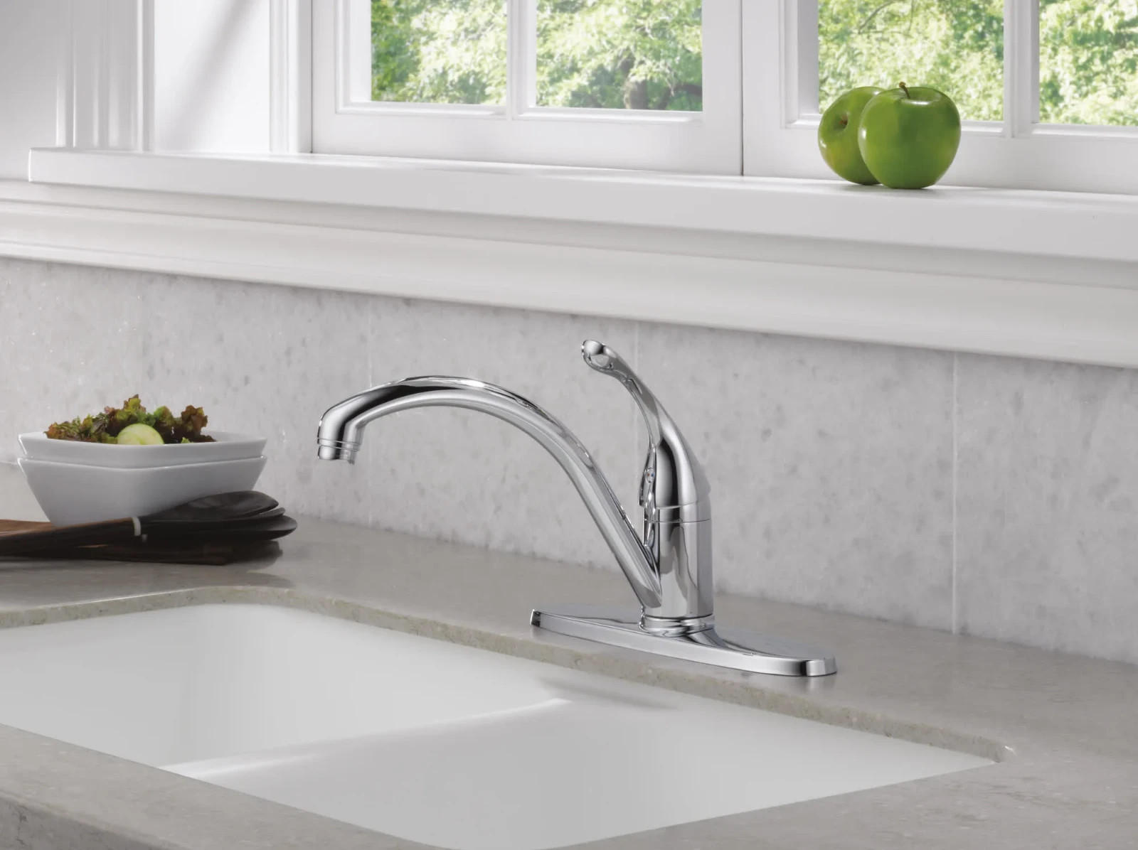 About this item Signature kitchen faucet Elegant design and finish The product is manufactured in United States Sleek design with the charm of simplicity The arc of the Collins spout adds clearance for easy filling of pots and pans Sleek design with the charm of simplicity The arc of the Collins spout adds clearance for easy filling of pots and pans Features DIAMOND Seal Technology DURAMOUNT Mounting w/ 2-1/2-Inch max deck thickness Sleek design with the charm of simplicity The arc of the Collins spout adds clearance for easy filling of pots and pans Features DIAMOND Seal Technology DURAMOUNT Mounting w/ 2-1/2-Inch max deck thickness Arched spout for easy filling of pots and pans
