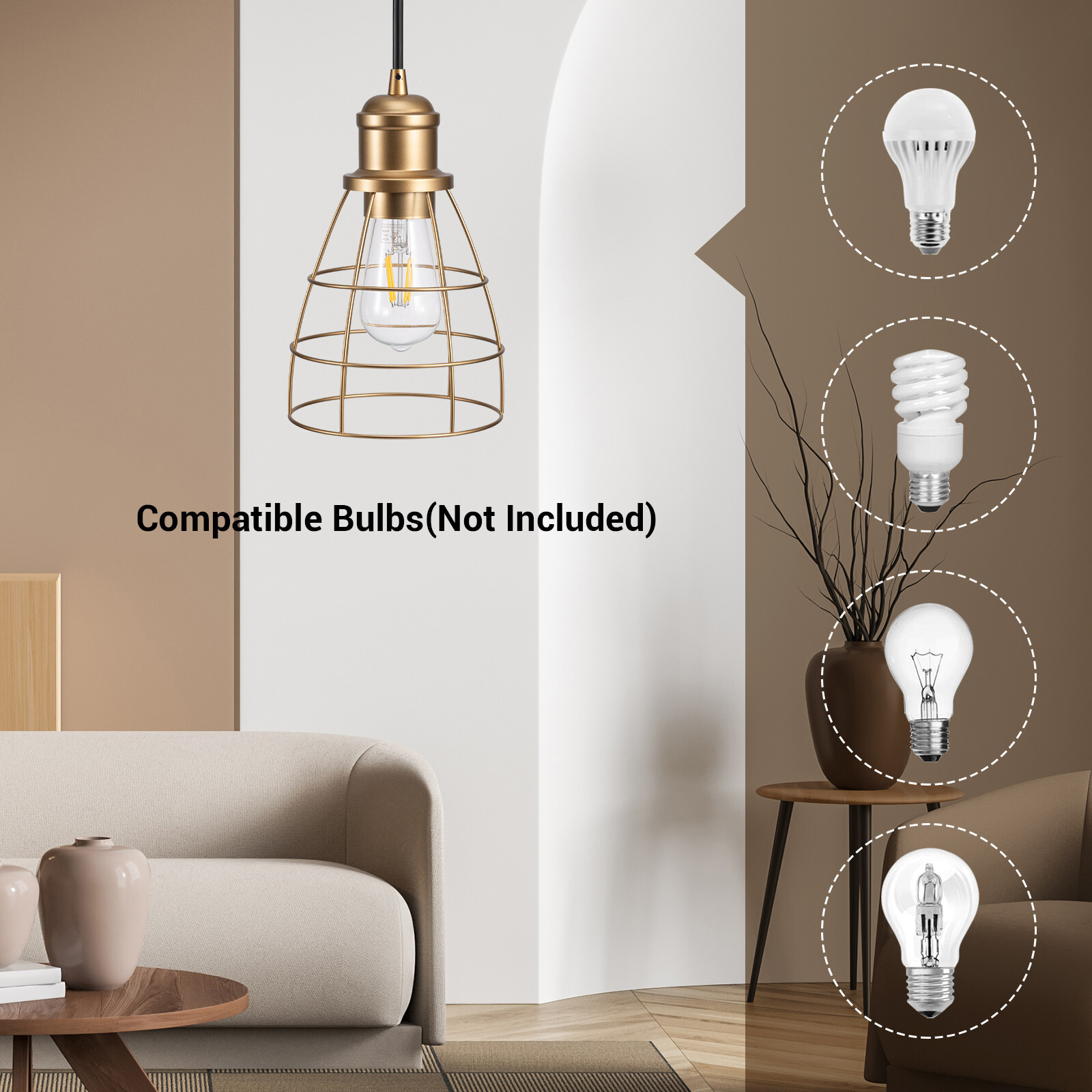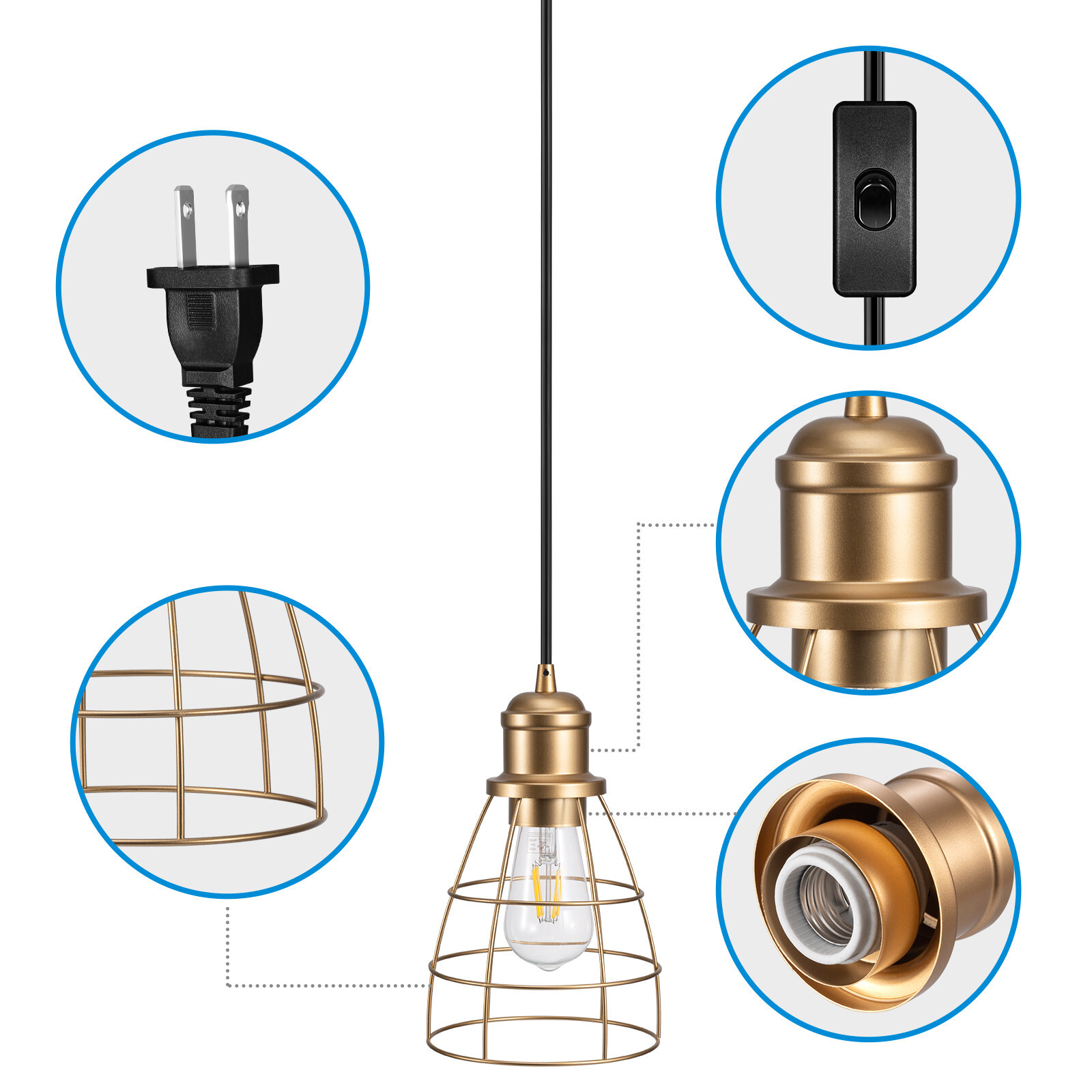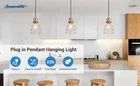 DEWENWILS Plug in Pendant Light, Hanging Lights with 15FT Cord, Industrial Pendant Light Fixture, E26 Base Socket, Farmhouse Pendant Lighting for Bedroom Kitchen Island Dining Room, 2 Pack, UL Listed About this item [Farmhouse Design & Durable] Plug-in hanging pendant light with wire features a durable curved iron metal shade with an understated sophisticated finish, rust and fade resistant; create your house a retro farmhouse vibe, or others, such as vintage, modern, industrial, etc. [Adjustable Height] The total length of the cord is 15 feet 18AGW , allowing you to easily adjust the vintage hanging light height to meet your lighting needs; the pendant light switch is located 5 feet away from the plug, no need to bend over to turn on/off [Safe & Wide Compatible] 120V AC 60Hz pendant light with plug, the light socket is standard medium E26 model; suitable for Incandescent Bulb (60W) / LED Bulb (13W) / CFL Bulb (13W) / Halogen Bulb (43W), bulb not included [Easy to Install] Tighten the lamp holder, lampshade and E26 bulb (not included) clockwise, then hang the plug of the pendant light on the provided hook, no hard wiring is required; connect the plug to the power supply, control the light by ON/OFF switch [Wide Application] This geometric metal black cage lampshade casts beautiful light and shadow, illuminating your living space with abundant and vivid light; suitable for dining room, bedroom, living room, kitchen island and sink, perfectly fits your home decor Specifications: Input Voltage: 120VAC 60Hz Max.load Power: Incandescent Bulb 60W Halogen 43W CFL 13W Type: Standard Medium E26 Specifications: Input Voltage: 120VAC 60Hz Max.load Power: Incandescent Bulb 60W Halogen 43W CFL 13W Type: Standard Medium E26