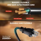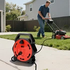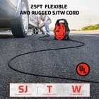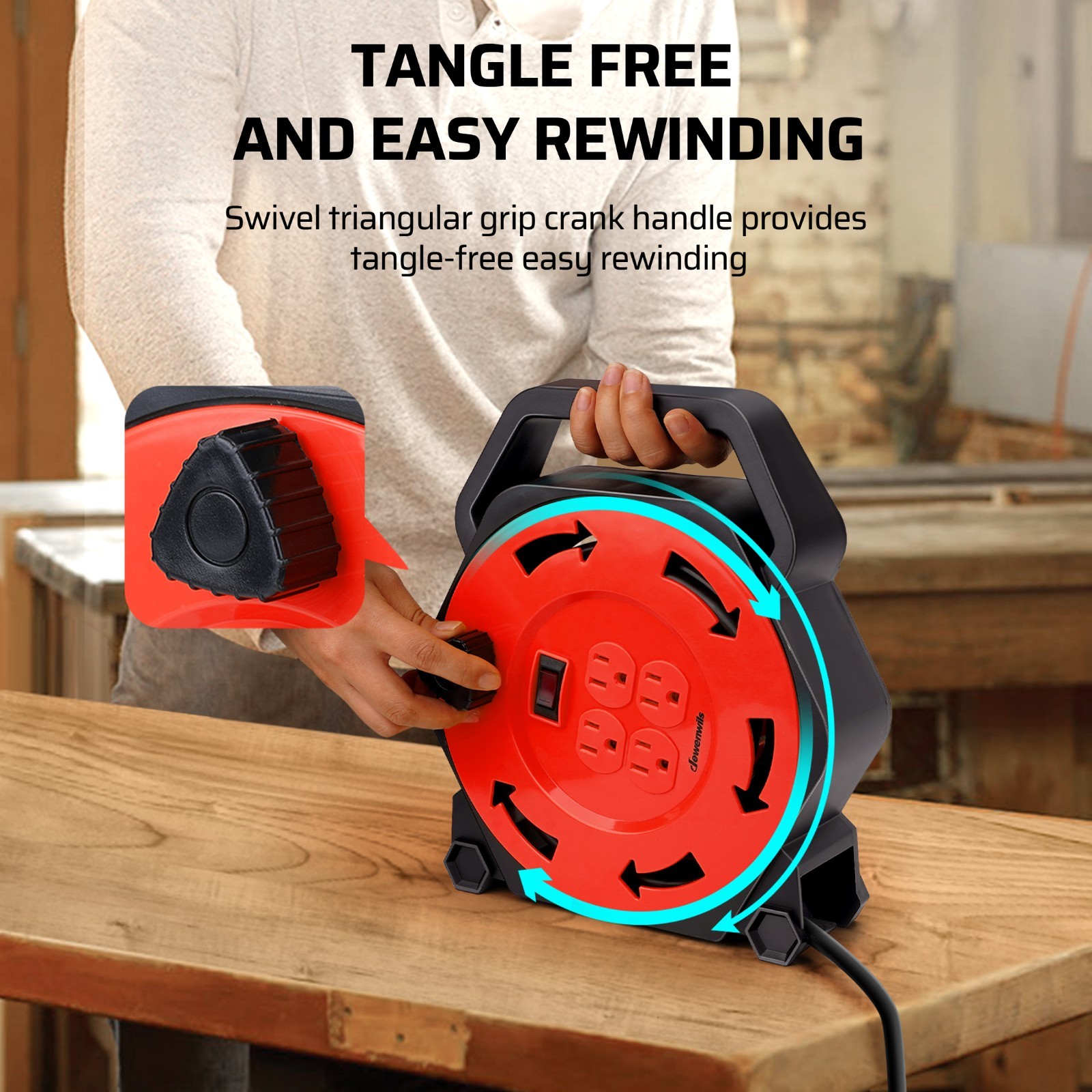 DEWENWILS Extension Cord Reel with 25 FT Power Cord, Hand Wind Retractable, 16/3 AWG SJTW, 4 Grounded Outlets, 13 Amp Circuit Breaker,Black and Red, UL Listed About this item 【 25 FT Durable Extension Cord 】 Electric cord reel comes with 25 feet long 16/3 gauge SJTW wear and weather resistant extension cord; for indoor/outdoor (dry-location) use only 【 Easily Wind and Unwind 】 Extension cord winder features a swivel triangular grip crank handle for tangle free, easy winding; helps to wind the power cord easily into electric cord reel and keep the cords neat and tidy for next use 【 4 Built-in Grounded Outlets 】 Rated for 13 amps, 125 volts, and 1625 watts, the heavy duty electrical cord reel power station has 4 integrated 3 prong outlets and allows you to power multiple tools at once 【 13A Circuit Breaker 】 Built-in 13A circuit breaker (lighted ON/OFF manual rocker switch) protects devices against short circuit and overloads which will automatically cut off power supply when the total current of the connected devices exceeds 13A; press the red switch to continue using after the cutting off 【 Compact and Easy to Carry 】 Weighs 3.12 lbs only; easy to grip handle on top; this handy extension cord wheel is lightweight and portable; very convenient to bring along to a job site or keeping handy in the garage; certified to UL