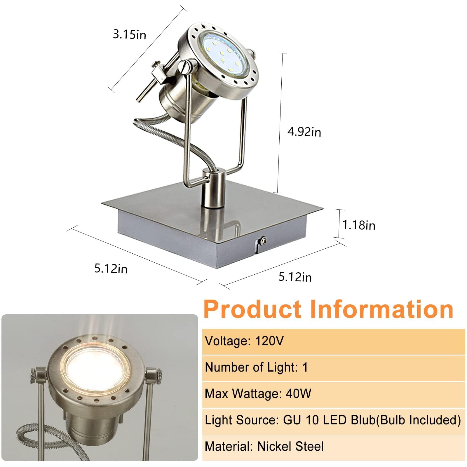 Why choose our mini track lighting? 1.Adjustable contemporary track-style This contemporary lighting fixture is adjustable meaning you can truly customize the lighting in your space.It can be rotate 360-degrees and 90-degree tilt. 2.Energy-Saving 1*Led GU10 LED Bulb bulbs gives of a soft glow,create a romantic and comfortable atmosphere for your sofa,picture,bedside,bed headboard,stairway etc.Cut down your electricity bill up to 85% by replacing 10W Halogen bulb with 3W LED Bulb. 3.Easy Install Just mount on your wall or ceiling, plug in and cover the cord to get started. Specification: Power:3W Power source:Plug-in Voltage:86-265V/50-60Hz Light source:Gu10 led bulb CRI:>85 Color temperature:3000K/warm white Material:nickel steel Package: 1x GU10 led bulb 1x User manual 1x LED adjustable track lighting Heat Dissipation: The lamp holders back hole design can be dissipate heat faster,prolong lifespan of the wall lamps. Light output with no heat to worry about Adjustable Track Heads: Flexible wall sconces head can point almost anywhere needed,it can be rotate 350-degrees and 90-degree tilt. Adjust the track-style light as desired to place light just where you need it Easy Install: Just mount on your wall or ceiling, plug in and cover the cord to get started.It’s perfect for creating a atmosphere in bedroom,kitchen,bathroom,sofa,hospitality,shop,bar and more.(Wire length:5.41ft,Tips: Our spot wall lamp comes with a plug,you can also connect the wires directly,just cut the cable & plug) Energy Saving: 3W soft warm light GU10 LED Bulb(bulb included) provides 240 lumen,it can last for 50,000 hours,saving over 80% electricity bill.And help you save the cost of frequent replacement of bulbs Friendly After-Sales Service: Factory sales, the assurance of quality, economic and affordable. Replacement or refund will be provided if you contact to us