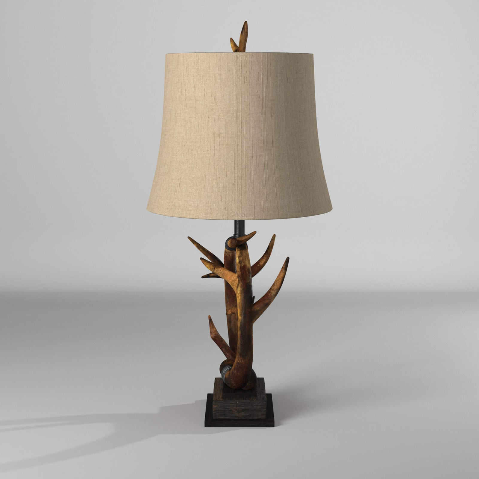 Show guests you are more of the outdoorsy type with this unique Antler Table Lamp. The lamp itself comes with a dark brown finish. The beige shade is made of hardback fabric. It is perfect for the living room, but it also works great for a man cave. This piece measures as 13.5"L x 18"W x 30"H - 12.8lbs. Crafted from: Poly, Hardback Fabric Suitable for any indoor location Requires 1 x 150-watt E26 Medium base Incandescent bulb (not included) - 120V Shade measures as 13.5"L x 18"W x 11.5"H