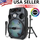 Feature: Unbelievable sound: 8" Woofer of pure audio power with enhanced bass. Connect and play music or song wirelessly via the built in Bluetooth from your iPhone, iPad, Android smartphone, Android tablet, PC, other MP3 devices or via USB flash drive. Two ways of power supply:AC/12V 3.2Ah Built-in Rechargeable Battery 8 Inch High Powered Portable Speaker System Support Memory Card,BT,FM,AUX Function Multi-media Function Music Player, with guitar input MIC Input with 1/4 Connect for to sing like karaoke Mounting Tripod Stands Included With Hemispherical LED Disco Colorful Linghting 8 Inch HIFI DISCO with Ambient Lights Bluetooth Speakers, Big Sound, Big Sound with Colorful Lights , for family gatherings, parties, shows, etc. Ideal for personal indoor home use or for outdoor. Includes the latest decoding chips supporting stable playback of MP3 up to 32GB USB disk/TF card (not included). Specification: Audio input: memory card/BT/FM/AUX Speaker Dimensions: 8" subwoofer Power supply: AC110-240V 50Hz/60Hz Output power: 1100W Frequency Response: 45Hz-18KHz Sensitivity: 85±2dB Battery capacity: 12V/4.5A rechargeable battery Colour: Black Package Included: 1 x 8" Wireless Party Speaker 1 x Wired Microphone 1 x Speaker Stands 1 x Charging Cable 1 x User Manual
