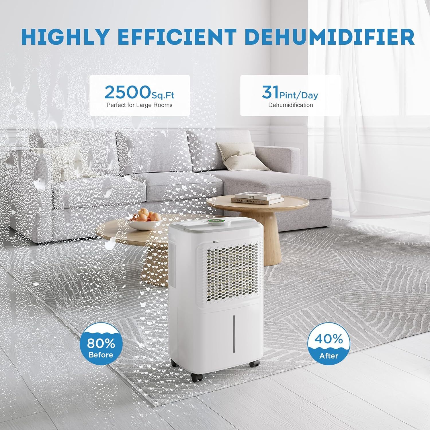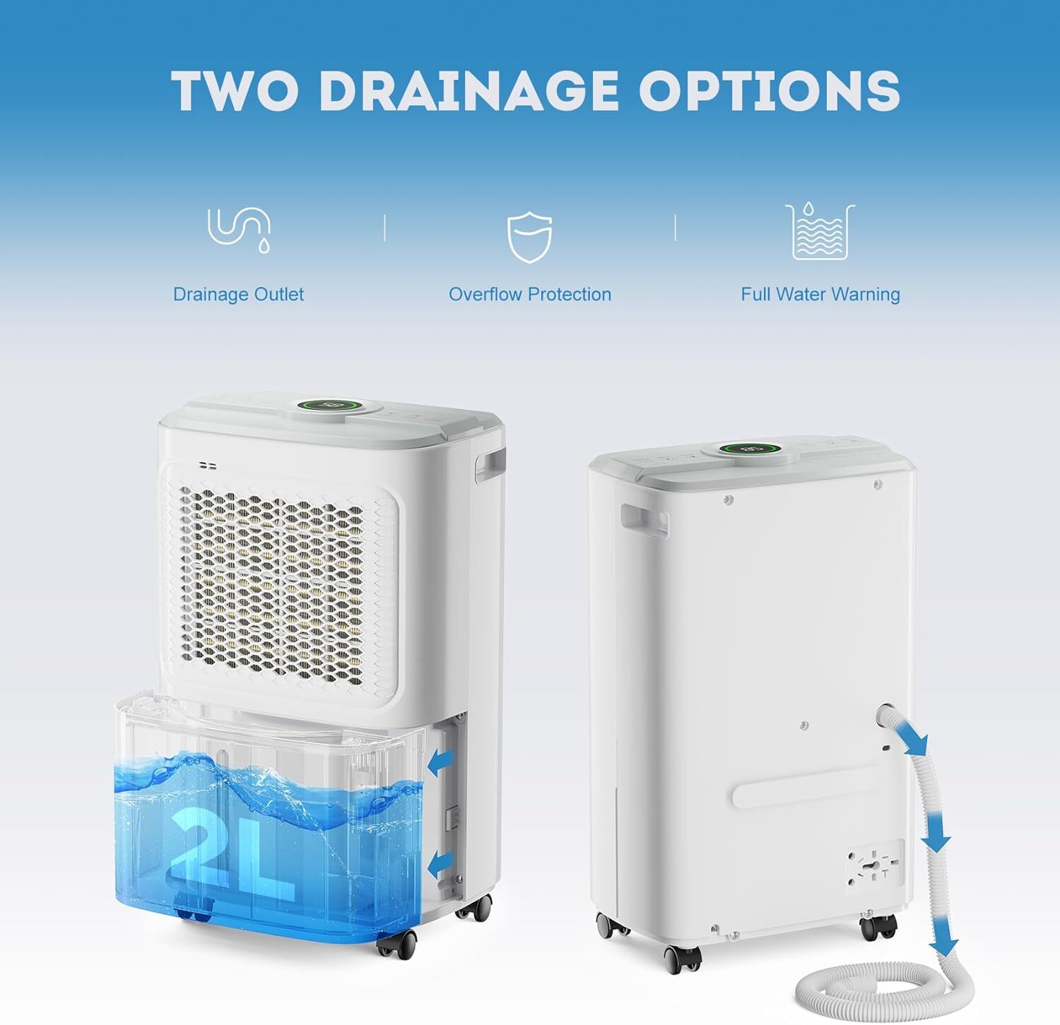 High-Efficiency Dehumidification:Dehumidifiers can remove up to 30 pints of moisture daily and adjust humidity from 30% to 80%, You can keep your place in the ideal 45%-55%. Perfect for basement, Office, Living Room, Bedroom, Garage, Laundry Room, Closet, RV, etc. 3 Dehumidification Options:DEHU/DRY/CONT modes,Three modes can provide you with automatic start and stop according to the humidity you set, quickly dry your wet clothes and continuously dehumidify them. Manual & Continuous Drain:Easily empty with the included 2L water tank when it is full, the dehumidifier will shut off automatically when the bucket is full and switch on again after the bucket is emptied. You also have the option of continuous drainage by inserting a 6.56ft/2m drainage hose. Super Quite & 24 h Timer:The dehumidifier adopts digital control panel and advanced silent design to ensure that the noise level during operation does not exceed 36 decibels. In addition, it also has a built-in 24Hr timer, which makes your dehumidification work more intelligent and energy-saving. Convenient & Long-Life Usage:Comes with four 360 rotatable wheels and handrails, it is easy to move, and you can easily move from room to room. The built-in filter can be cleaned freely at any time, and you can clean your dehumidifier quickly anywhere.