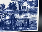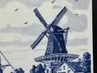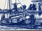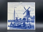 This vintage Delft tile from Plateelbakkery Schoonhoven features a traditional Pictorial design showcasing a blue and white Windmill scene, typical of Delft production style. Handmade in Holland, this 6" x 6" square tile is crafted from porcelain or ceramic, with a glossy finish. The hand-painted decorative piece is perfect for any room, adding a touch of Dutch charm to your decor. Has crazing.