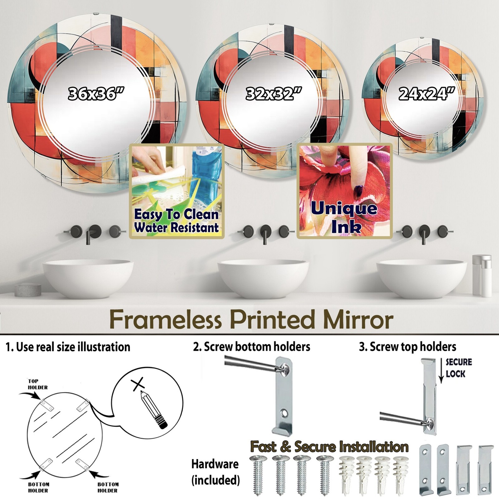 In an industry that has seen very little innovation of the years, DesignArt proudly brings you our exclusive collection of mirrors with printed designs. Mirrors, a staple decor item in every home have now become more than just a mirror- they have become piece of art.Our unique design and exclusive technique allows for the ink to be raised a few millimeters above the mirror, yet remain scratch proof and fade resistant.The mirror itself is of the highest quality measuring 1/4 inch in thickness and providing a crystal clear distortion free reflection. As with the benefits of a traditional mirror, it naturally provides an appearance of increased space in the surrounding area and increased brightness and lighting.Premium backing prevents corrosion in bathroom environments and all mirrors come Free Shipping Over $49.99* Details Designart "Blue Orange Mid Century Geometric Abstractions I" Mid-century Modern Product Description: In an industry that has seen very little innovation of the years, DesignArt proudly brings you our exclusive collection of mirrors with printed designs. Mirrors, a staple decor item in every home have now become more than just a mirror- they have become piece of art. Our unique design and exclusive technique allows for the ink to be raised a few millimeters above the mirror, yet remain scratch proof and fade resistant. The mirror itself is of the highest quality measuring 1/4 inch in thickness and providing a crystal clear distortion free reflection. As with the benefits of a traditional mirror, it naturally provides an appearance of increased space in the surrounding area and increased brightness and lighting. Premium backing prevents corrosion in bathroom environments and all mirrors come with the wall hangers already installed allowing it to be hung vertically or horizontally. Drywall anchors and screws are also included for your convenience. Each mirror is carefully inspected prior to shipping and packaged securely with several layers of protective packaging, ensuring a safe delivery. Designarts' mirrors are available in the following sizes: Round 35.4" Round 31.4" Round 23.6" Oval 19.6"x29.5" Oval 23.6"x35.4"