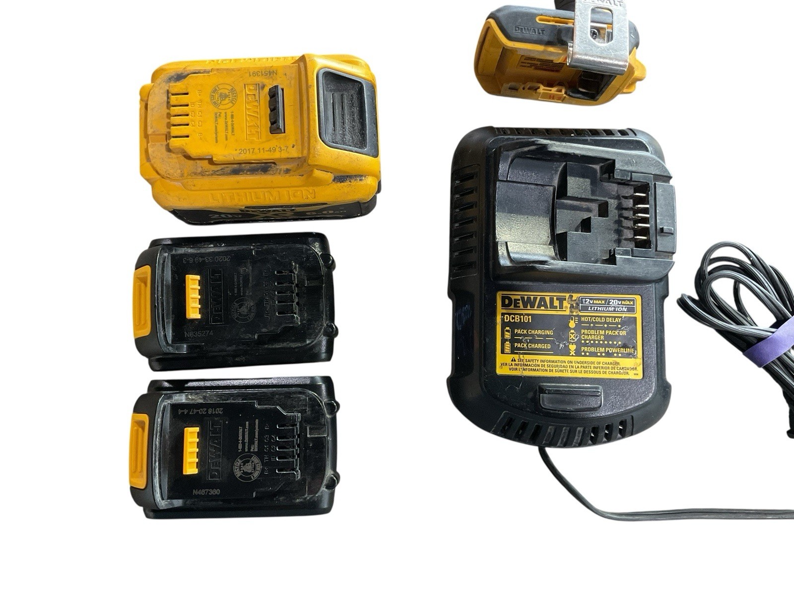 Comes with circular saw DCS391, Drill dcd777, driver dcf887, oscillating Multi tool dcs356, 1 charger, 2 dcb201 batteries, 1 dccb206 6ah battery. Items are used in various condition, they have some writing on them and wear and tear from use. Please reach out with any questions you may have before your purchase. Thank you. E75002283